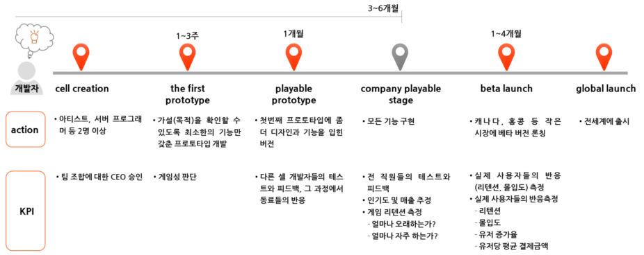 셀이 구축되면 최소 기능만 갖춘 프로토타입 개발을 시작으로, 주변 동료에게 피드백 받는 ‘게임이 가능한 프로토타입(playable prototype) 단계’, 전사 직원에게 게임을 공개하여 평가받는 ‘전사적으로 게임이 가능한(company playable) 단계’를 거쳐 베터버전 론칭, 글로벌 출시 순으로 이어진다. 각 단계별로 지켜야할 개발 시간은 있지 않다. 셀은 필요한 만큼 시간을 쓸 수 있다. 예산도 마찬가지이다. 위로부터 예산이 할당되는 것이 아니라 셀이 필요한 만큼 예산을 사용할 수 있다.