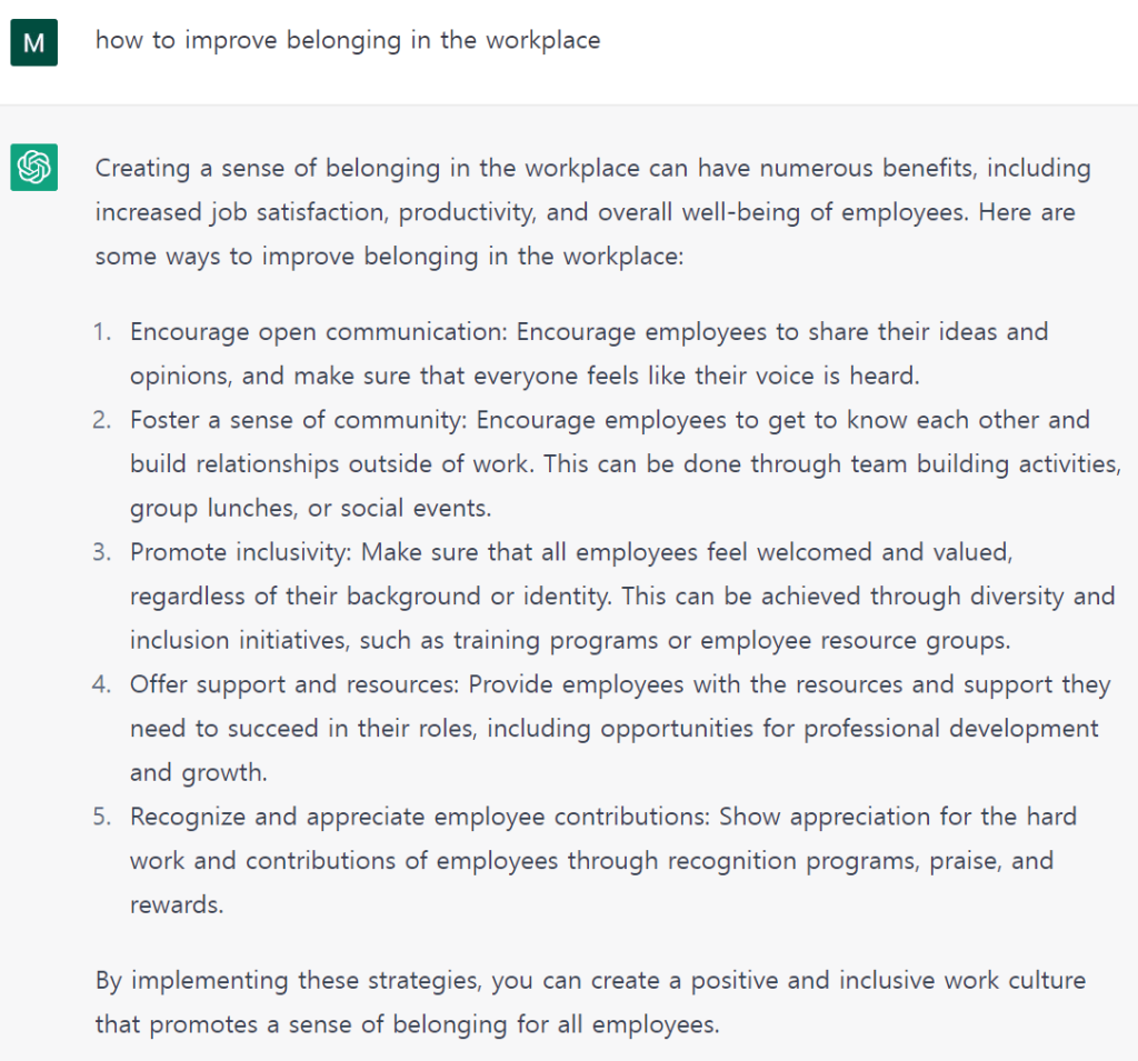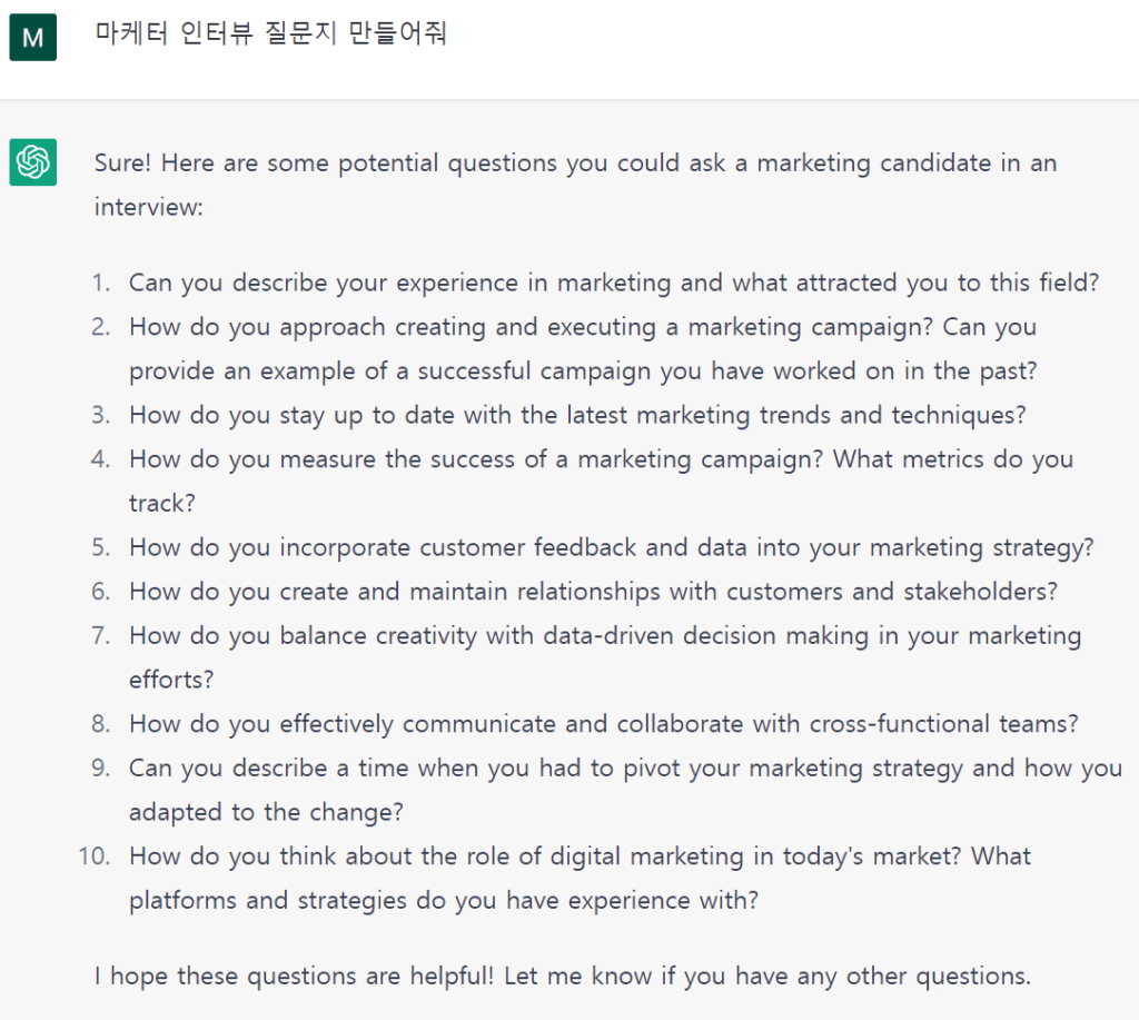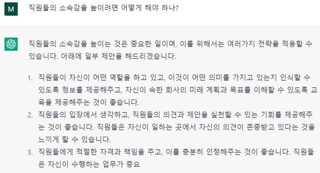 저는 HR과 관련해서 일반적인 주제부터 민감한 이슈까지 여러 가지를 요청을 해보았는데요. 제 예상을 뛰어넘은 사뭇 똑똑한 답변에 웃음이 나더군요. 아래는 저와 chatGPT와의 대화입니다.