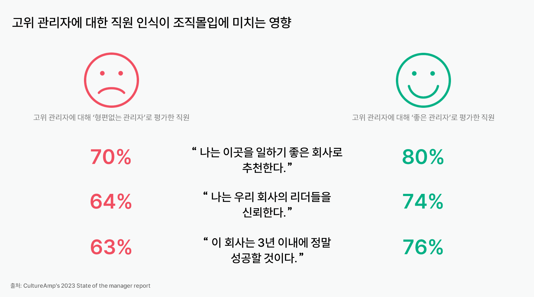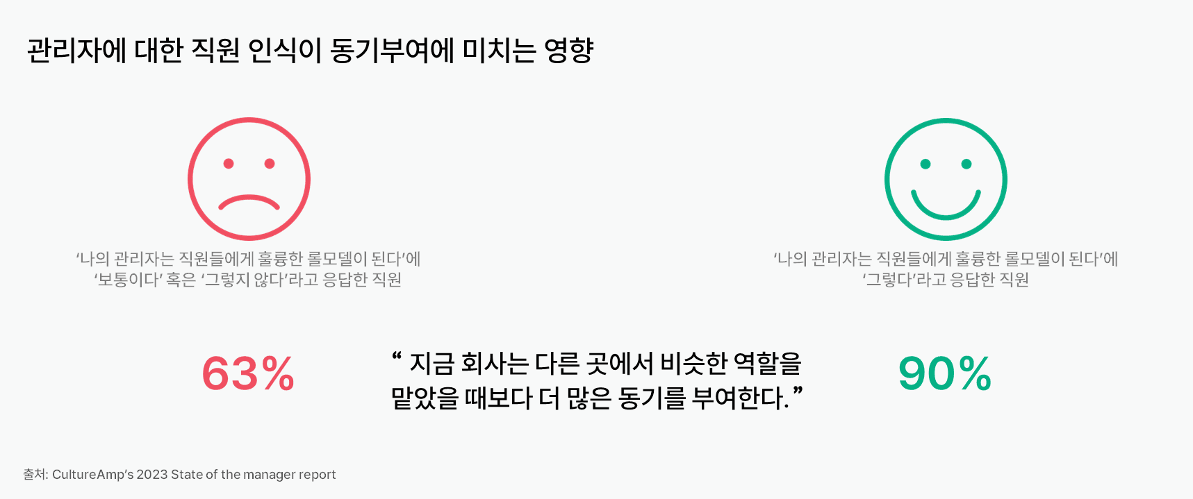 직원경험 플랫폼 컬처앰프(Cultureamp)의 조사에 따르면, 구성원이 관리자를 바람직한 롤모델로 인식하느냐의 여부에 따라 조직 비전에 대한 인식, 동기부여, 재직 의도 등에서 차이를 보인다.