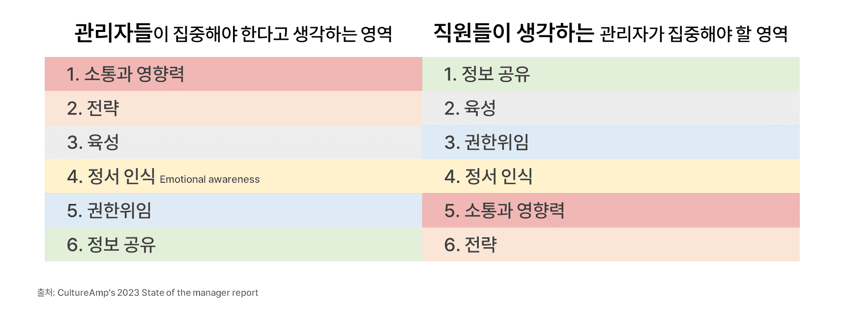 리더가 구성원에게 효과적으로 영향력을 미치기 위해서는 자신이 팀원에게 기대하는 것, 팀원이 자신(리더)에게 기대하는 것은 무엇인지 명확하게 인지하고 소통할 필요가 있다. 컬처앰프의 분석에 의하면, 리더와 팀원이 중요하게 생각하는 요소는 그 우선순위에서 차이가 있는 것으로 나타났다.