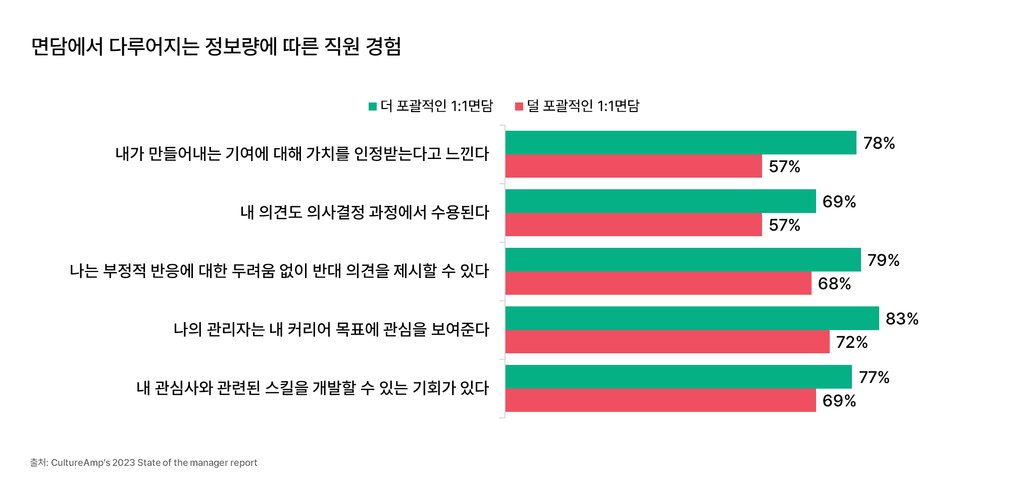 컬처앰프의 분석에 따르면, 양질의 1:1면담은 퇴사율을 낮춰주고 직원들에게 조직, 업무에 대한 긍정적인 경험을 제공한다. 1:1면담에서 좀더 포괄적으로 정보 공유가 이루어질 때, 직원들은 자신의 업무 기여도를 인정받고, 자신의 의견이 수용되고, 성장하고 있다고 느끼기 쉽다. “잘 했어”라는 짧은 말 한마디 보다 구체적인 설명을 담은 피드백이, 업무 진척 뿐만 아니라 직장 생활, 커리어 개발 등 직원의 관심사를 폭넓게 다루는 면담이 직원 경험을 향상시킨다는 것이다.
