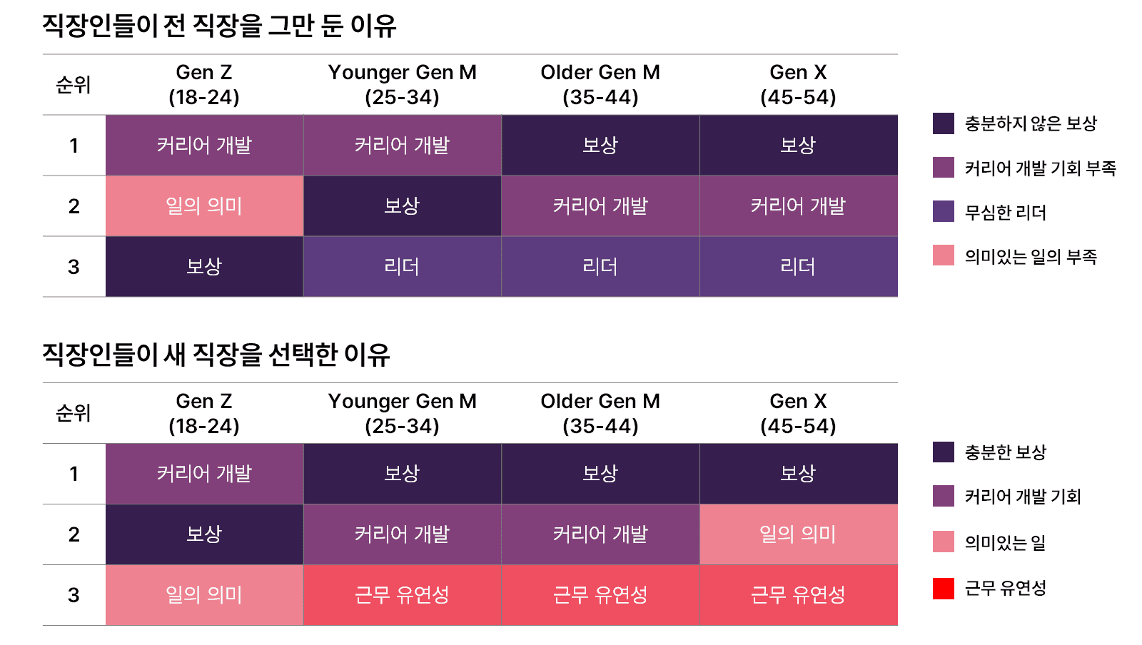맥킨지의 조사에 따르면, 커리어 개발은 구성원의 입퇴사 결정에 중대한 영향을 미치는 요인이다. 특히 Z세대의 경우 커리어 개발 기회가 보상보다 더 중요하게 고려되는 것으로 나타났다.