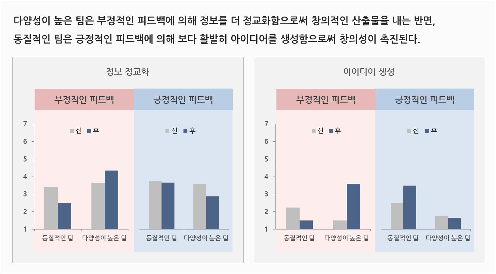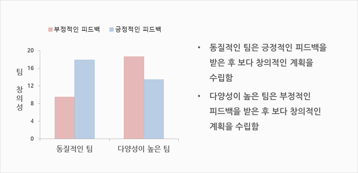 반면 동질적인 팀은 정보, 관점을 공유하기 때문에 새롭게 내놓을 수 있는 정보가 한정되어 있다. 그래서 부정적인 피드백은 더 활발한 논의를 촉진시킨다기 보다는“우리가 가진 정보, 아이디어가 좋지 않다”라고 받아들여져 사기저하를 유발하고, 논의, 아이디어 제시 등을 위축시키는 것으로 해석된다. 하지만 긍정적인 피드백은 “잘 하고 있다”는 지표가 되기 때문에 더 활발하게 의견 제시, 즉 확산적 사고를 촉진하여 창의성을 발휘하게 만드는 것으로 보인다.