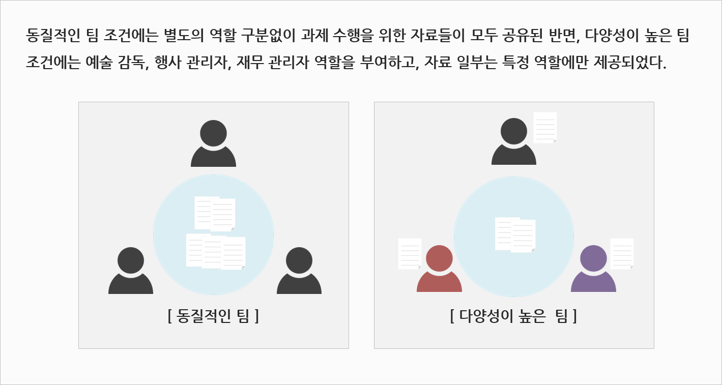 팀은 세 명으로 구성되고, 동질적인 팀에는 과제 수행과 관련된 자료가 모두에게 공유되었다. 반면 다양성이 높은 팀에는 참가자에게 예술 감독, 행사 관리자, 재무 관리자 등 차별적인 역할을 부여하고, 자료 일부는 모두에게 공유되었지만, 다른 일부는 특정 역할에만 제공되었다.