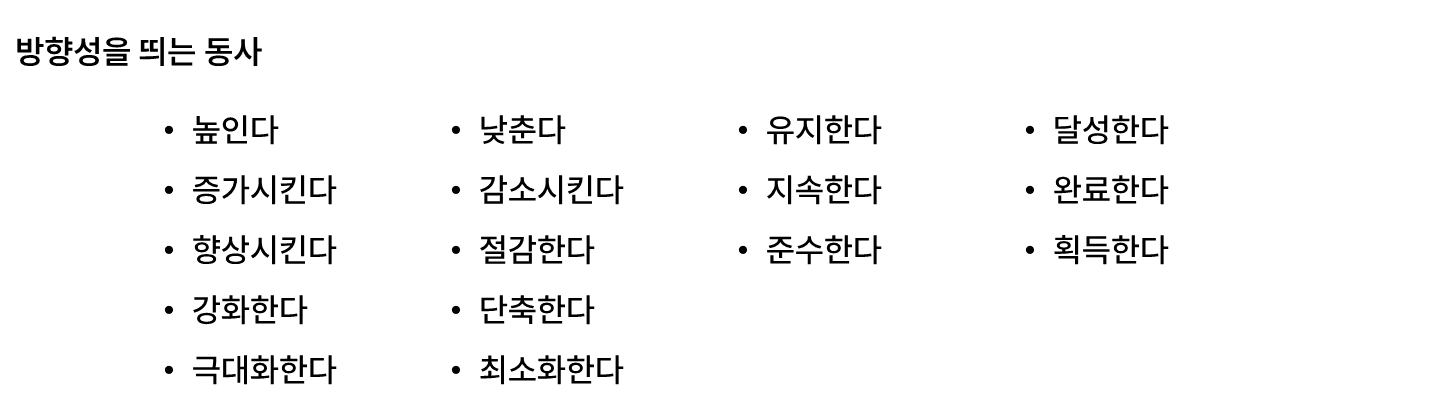 - 성과 목표 표현 방식: [기대 결과]를 [달성 수준] [방향성 동사]한다.