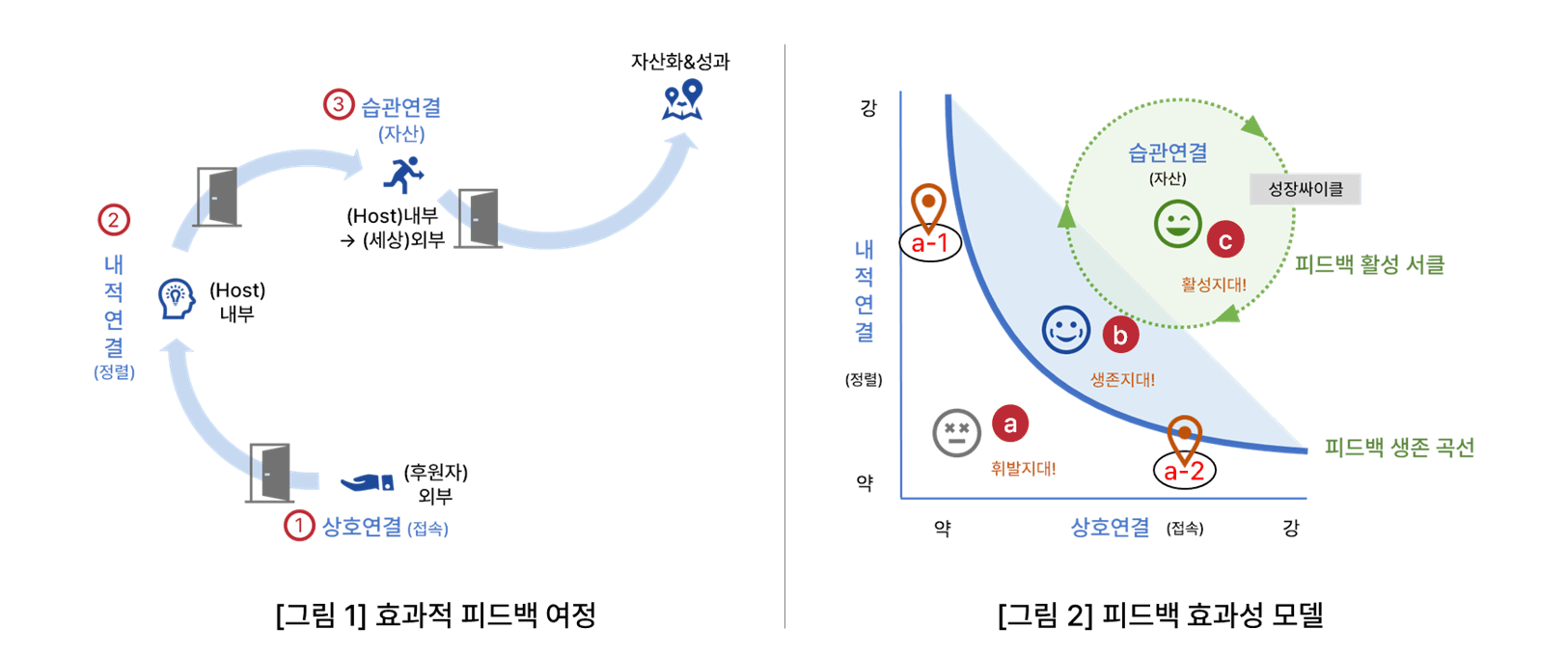 ① 상호연결(접속): 대부분의 피드백이 외부에서 시작되기 때문에, 외부 피드백 후원자(예: 리더)와 피드백 활용의 주체인 Host(예: 업무담당 팀원)와의 ‘상호연결(접속)’이 첫 관문이 됩니다. 리더의 선한 의도나 탄탄한 말솜씨를 기반으로 한 피드백도 서로 접속되지 않으면 리더의 톱니바퀴만 혼자 열심히 돌리고 있는 꼴이 됩니다.