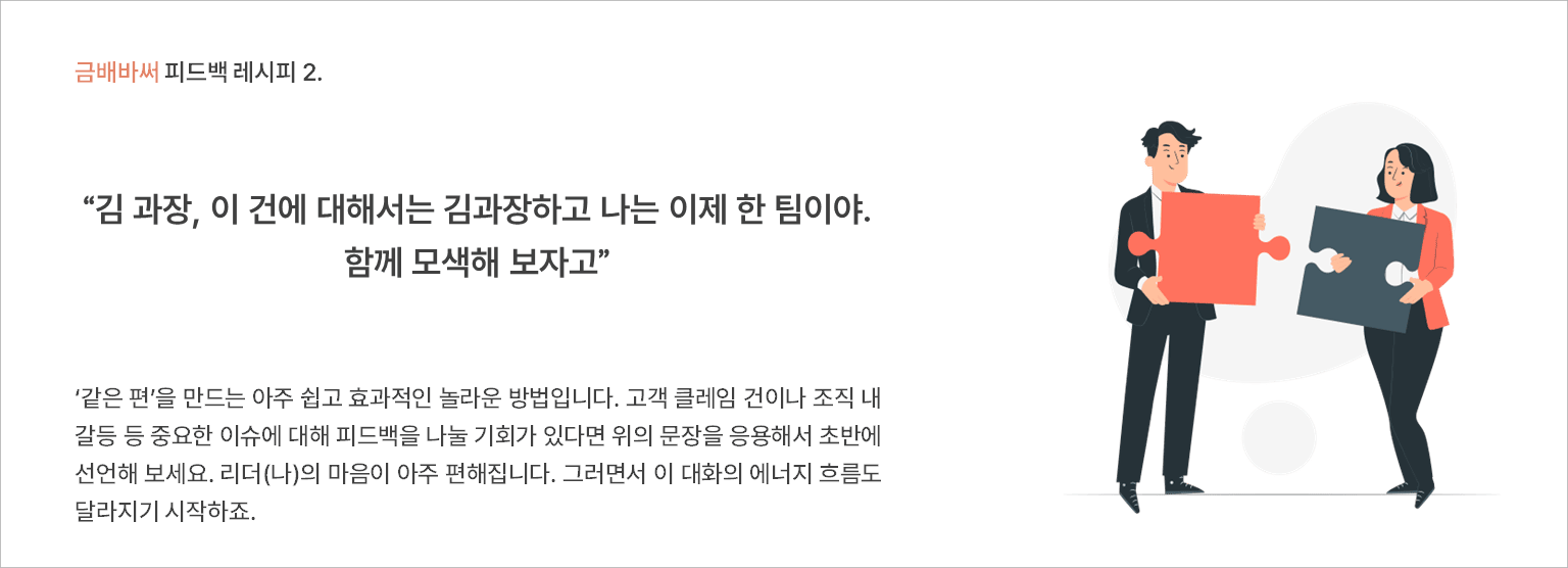 이 글은 조직 현장에서, 피드백이 목에 걸려 망설이다 기회를 놓치고 있는 수많은 리더들을 위한 위로와 응원의 글입니다. 더불어, HRer들의 고민을 함께 모색해보는 글이기도 합니다. 현학적이고 남의 집 이야기 같은 심리학 실험 통계를 근거로 기름 덧칠을 하기 보다는, 변화하는 현장 상황에서 리더들이 언제든 응용 가능하도록 쉬운 근본 원리를 찾아보고 매회 마지막에 ‘금방 배워 바로 써먹는’ 금배바써 레시피를 엄선하여 첨부드립니다. 다만, 이 레시피는 본문의 원리를 이해해야만 맛있게 써 먹을 수 있습니다.