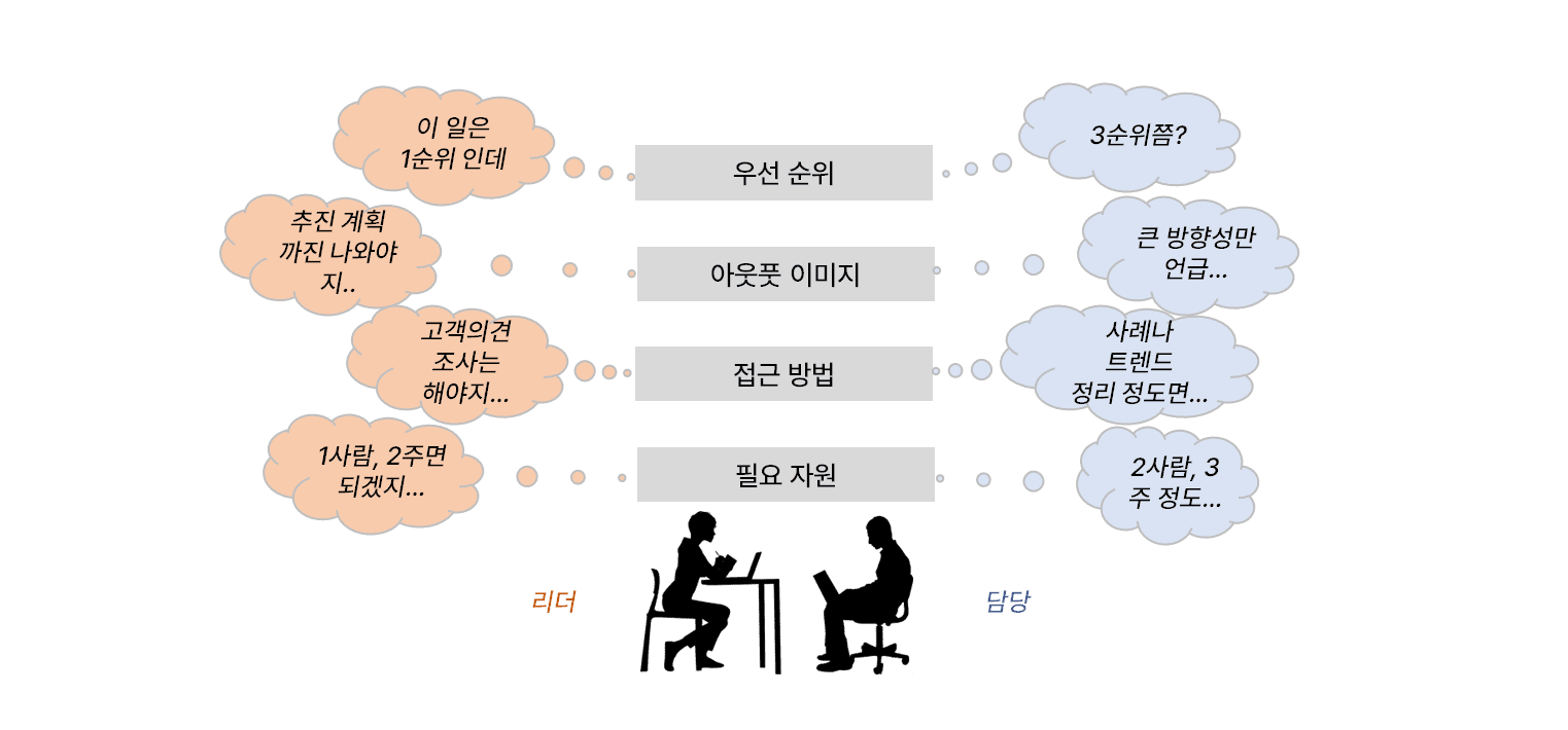 안타깝게도 많은 리더들의 의도와 달리, 그리고 생각 이상으로 조직 내 어떤 이슈(업무, 태도, 상식 등)에 대해서 구성원들과 상당히 큰 인식의 ‘간극’이 존재하고 있었습니다. 예를 들어, 업무와 관련되어 자주 등장하는 간극은 주로 ‘일의 우선순위, 아웃풋 이미지, 접근방법, 필요자원’ 등의 수준에 대한 인식의 간극이었습니다. 간극이 별로 없을 거라는 착각에서 리더십의 악순환은 시작됩니다. 리더의 마음 속에서 ‘그건 너무 당연한 상식 아닌가? 내가 보기엔 시간과 자원은 충분했는데?’ 같은 생각이 자주 든다면 갈라진 간극에서 용암이 슬슬 비져 나오는 상황이라 보시면 될 것입니다.