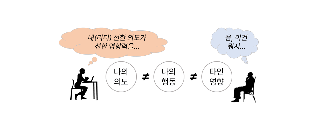 [그림 4]에서 보는 것처럼, 모든 리더십 이슈의 공통점은 단 하나입니다. ‘나(리더)의 의도’와 그 의도를 담았다고 생각하는 ‘리더의 행동’과 그 행동을 통해 끼쳐진 ‘파급효과(영향력)’가 다 다를 가능성이 크다는 것입니다. 선의의 의도를 가진 리더들은 많은 노력을 하시는 만큼 많은 착각을 하곤 합니다. ‘내 선한 의도를 적절한 그릇에 담아 행동했으니 팀원들도 그리 느꼈을 것이라고’말이죠. 바로 상호 왜곡과 고착화의 시작입니다.