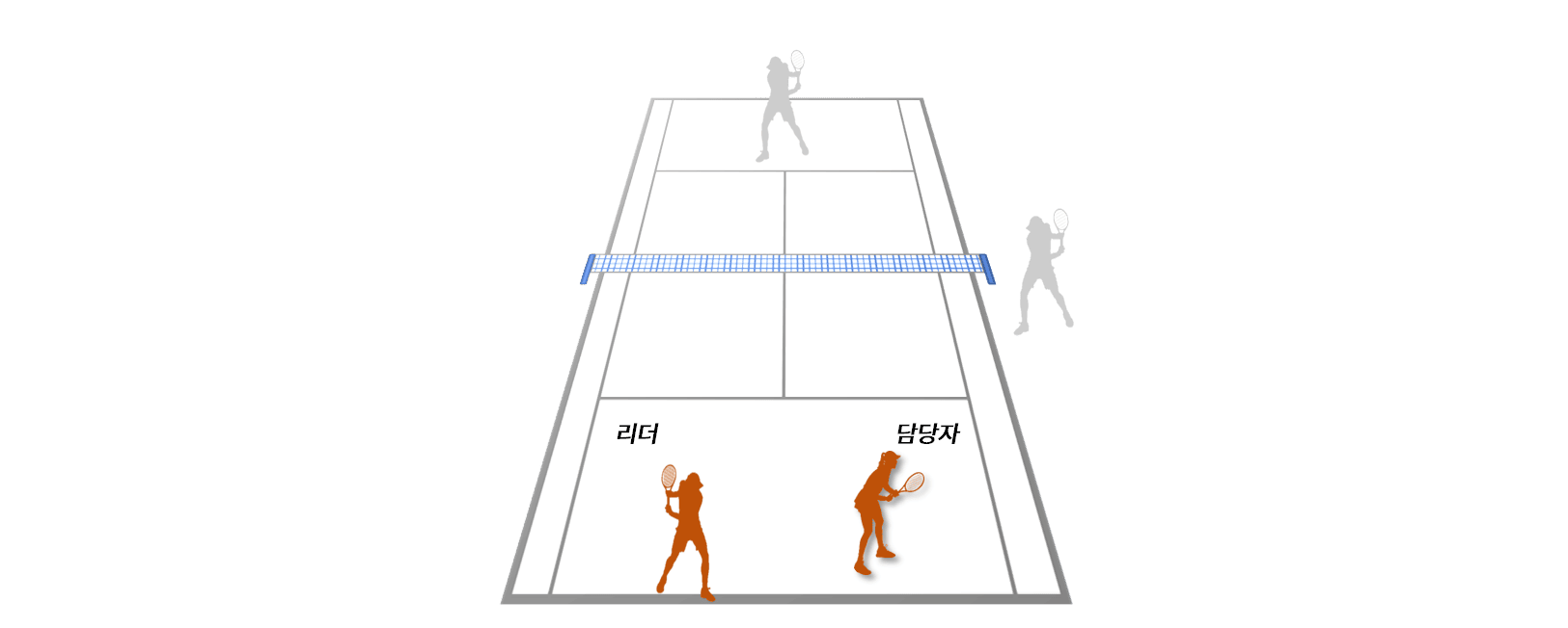 [그림 3] 리더는 구성원의 반대 편 혹은 심판 자리가 아니라 구성원과 같은 쪽 코트에 서야 한다.
