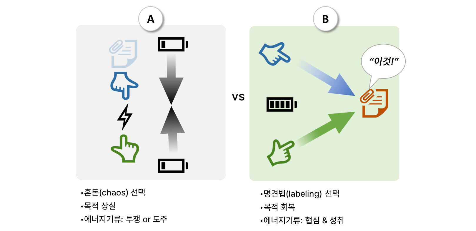 그것을 바로 실천할 수 있는 아주 간결하고 강력한 명견법(名見;labeling)을 소개합니다. 이 방법도 ‘스킬’이 아니라 본질’에 대한 이야기입니다. 지금 김과장이 작성한 사업기획안(해결할 이슈)을 들고 문을 열고 들어왔습니다. [그림 5]의 Ⓐ와 Ⓑ를 비교해 보세요. Ⓐ에서 김과장은 본인이 가져온 ‘사업기획안’과 연합이 된 상황이 되어 본인이 왠지 공격을 받는 다는 느낌을 받게 되고, 당연히 저항을 하거나 그냥 무릎을 꿇어 버리는 극단적 행동을 하게 됩니다. Ⓑ에서 리더(당신)는 마음 속으로 김과장의 코트 쪽에 서서 시작합니다. (실제 앉는 의자를 같은 쪽을 보게 위치하는 방법도 에너지 전환에 매우 큰 도움이 됩니다) 다음으로, 그 보고서에 일부러 이름을 붙인 후, 김과장으로부터 제3의 존재로 ‘분리’시켜 옆으로 실제로 빼며 위치를 옮겨 보십시오. 예를 들어 “이 ‘사업기획안’이란 놈을 어떻게 보완하면 내부 고객(경영진)에게 우리 사업을 어필할 수 있을까?” 라구요. 이때 중요한 것은 ‘이름 붙이기’와 ‘물리적 분리’가 느껴지게 하는 것입니다. 즉, 그 ‘사업기획안’을 우리가 서 있는 코트의 반대편 코트로 보내는 겁니다. 극복할 이슈를 우리 자체에서 떼어내어 ‘우리가 함께 해결할 제3의 객관적 객체로 공동의 목표’를 만드는 과정이죠.
