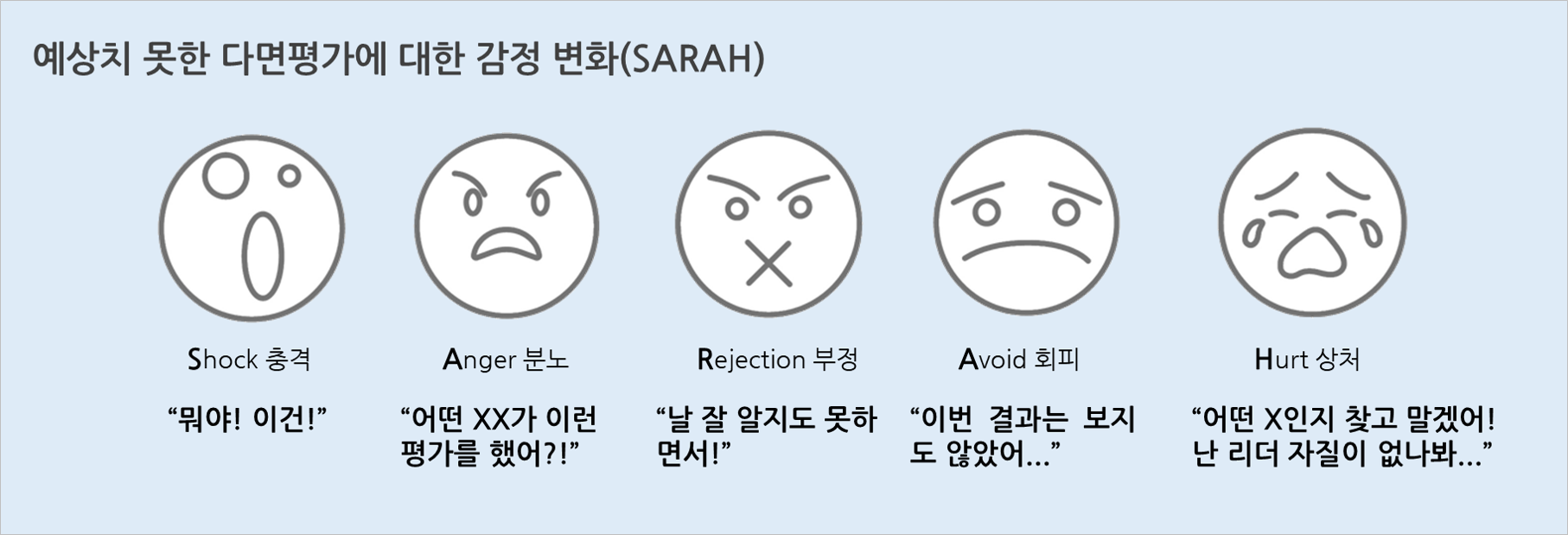 S(Shock, 충격 : 뭐야! 이건!) → A(Anger, 분노 : 어떤 XX가 이런 평가를 했어!) → R(Rejection, 부정 : 날 잘 알지도 못하면서!) → A(Avoid, 회피 : 이번 결과는 보지도 않았어..) → H(Hurt, 상처 : 어떤 X인지 찾고 말겠어! 난 리더 자질이 없나봐..)
