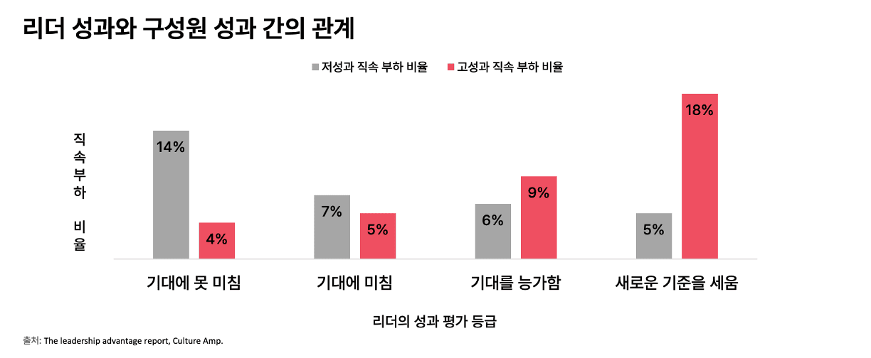 리더가 받은 성과 평가 점수와 구성원의 성과를 비교한 결과, 탁월한 리더가 이끄는 조직에는 탁월한 성과를 내는 구성원의 비중이 더 높은 것으로 나타났다.