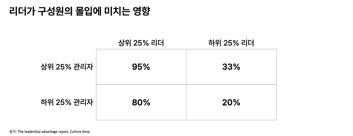 상위 25% 리더와 매니저가 이끄는 조직에서는 구성원의 95%가 몰입을 보이는 것으로 나타났다. 상위 25%의 리더와 하위 25% 관리자가 이끄는 조직에서는 구성원의 80%가 몰입을 보인 반면, 하위 25% 리더와 상위 25%의 관리자가 이끄는 조직은 구성원 33%만이 몰입을 보였다. 구성원의 몰입에 관리자보다 리더가 더 큰 영향을 미치는 것이다.