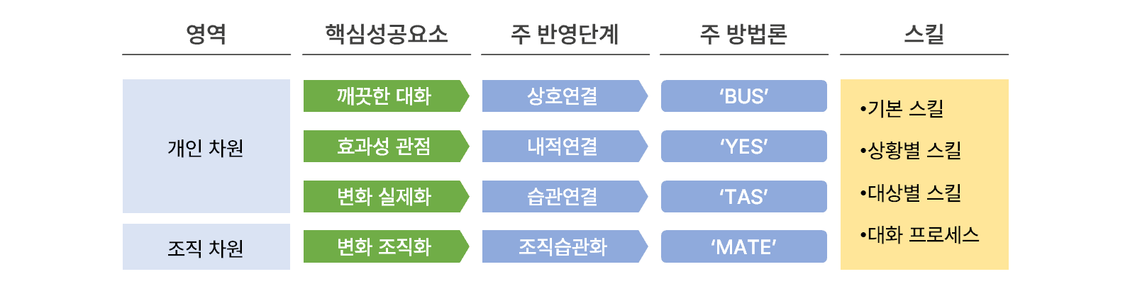 [그림 1]은 조직 내에서 지향해야 하는 깨끗한 피드백(Clean feedback) 문화를 현장에서 실천하기 위한 필수 요소를 요약한 내용입니다. 4가지의 핵심성공요소가 있고, 1~3부에서 다루었던 주요 반영 단계와 방법론을 연결시켜 실제 실행 시 각 요소가 별개로 따로 놀지 않고 취지와 방법론을 일관성 있게 적용할 수 있게 하였습니다. 4부에서는 [그림 1]의 스킬 영역 중 ‘기본 스킬’ 몇 가지만 다루어 보겠습니다. 기존의 유명한 스킬도 냉철하게 뒤집어 보며, 진짜 본질을 찾아가 보죠.
