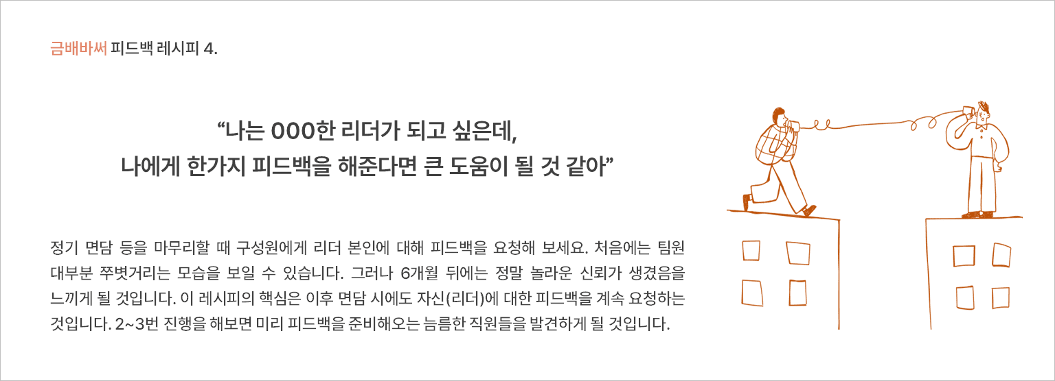 이 글은 조직 현장에서, 피드백이 목에 걸려 망설이다 기회를 놓치고 있는 수많은 리더들을 위한 위로와 응원의 글입니다. 더불어, HRer들의 고민을 함께 모색해보는 글이기도 합니다. 현학적이고 남의 집 이야기 같은 심리학 실험 통계를 근거로 기름 덧칠을 하기 보다는, 변화하는 현장 상황에서 리더들이 언제든 응용 가능하도록 쉬운 근본 원리를 찾아보고 매회 마지막에 ‘금방 배워 바로 써먹는’ 금배바써 레시피를 엄선하여 첨부드립니다. 다만, 이 레시피는 본문의 원리를 이해해야만 맛있게 써 먹을 수 있습니다. 1부에서부터 차례로 읽으시면 이 글을 활용하는데 더 큰 도움이 됩니다.