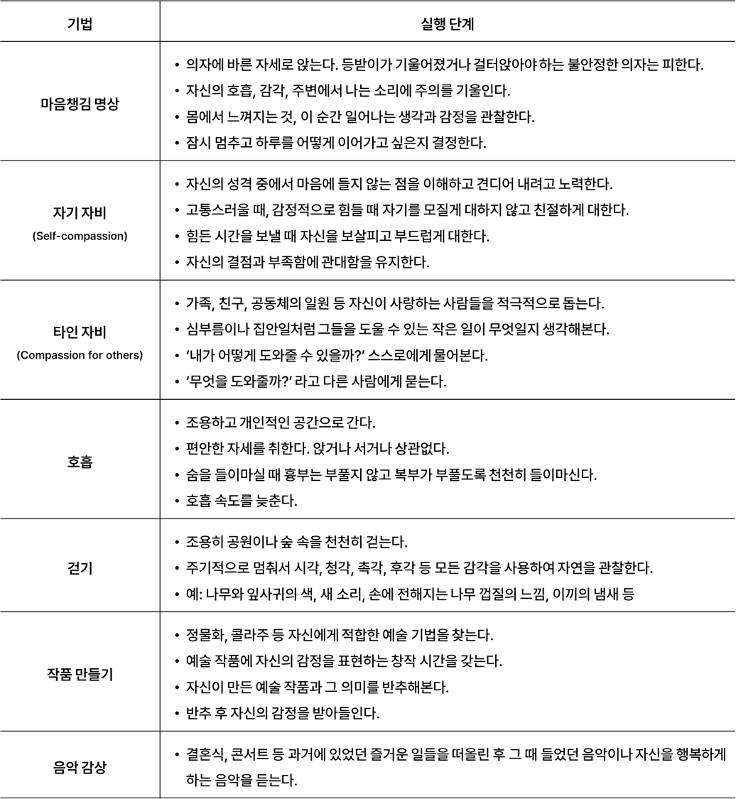 다양한 마음 훈련 기법을 시도하여 자신에게 맞는 방법을 찾아 꾸준히 연습한다면 어려운 상황에 덜 부정적으로 반응하고 침착하게 대처할 수 있는 능력을 높여줄 것이다. 그리고 향상된 자기 인식 능력은 효과적인 자기 관리를 넘어 타인에 대한 민감성, 즉 공감을 높여주기 때문에 대인관계에 개선을 가져다 준다.