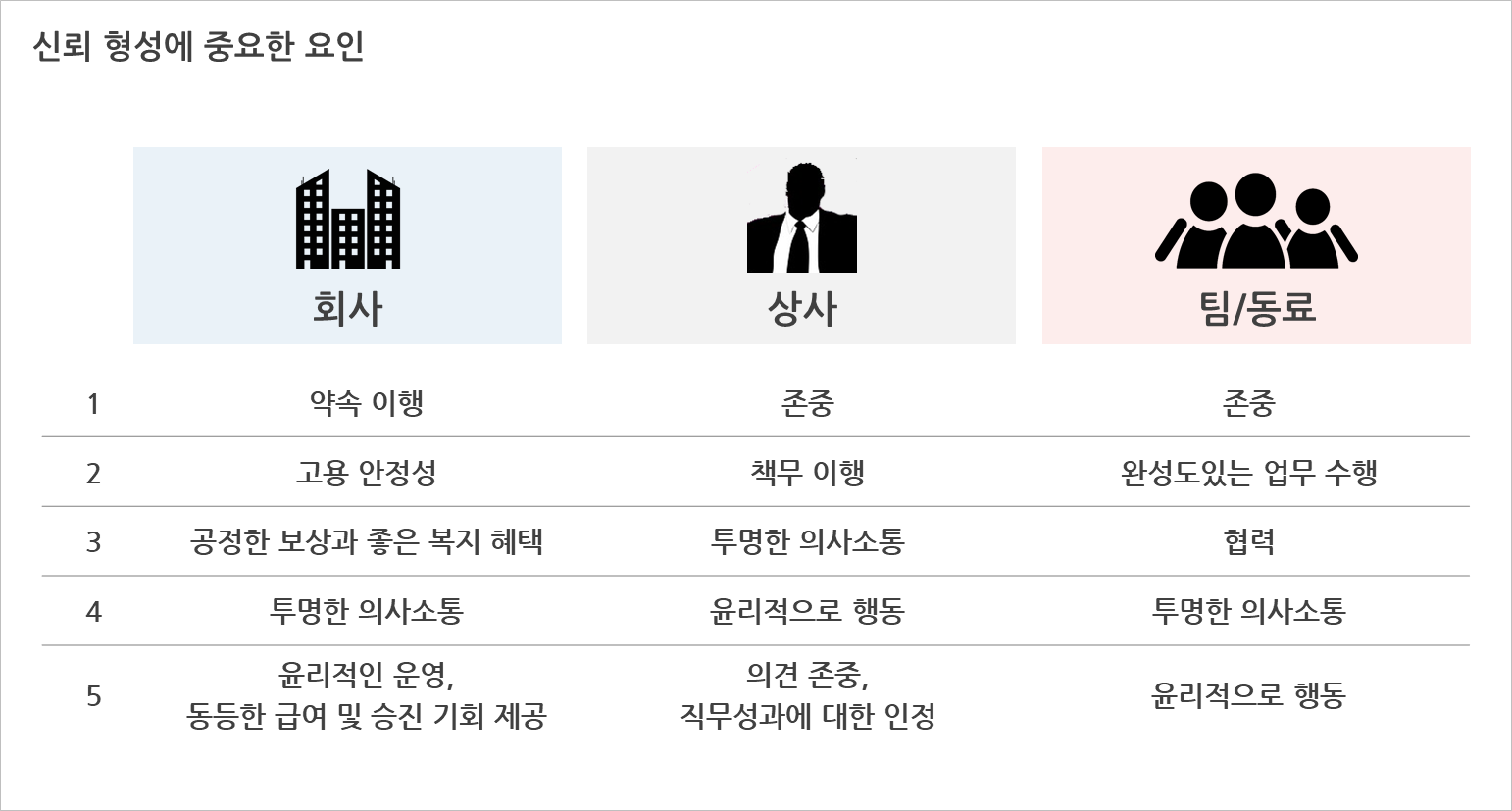 그렇다면 조직 신뢰를 높이려면 어떻게 해야 할까? 조직원들은 약속 이행, 존중이 신뢰 형성에 매우 중요하다고 응답했다.