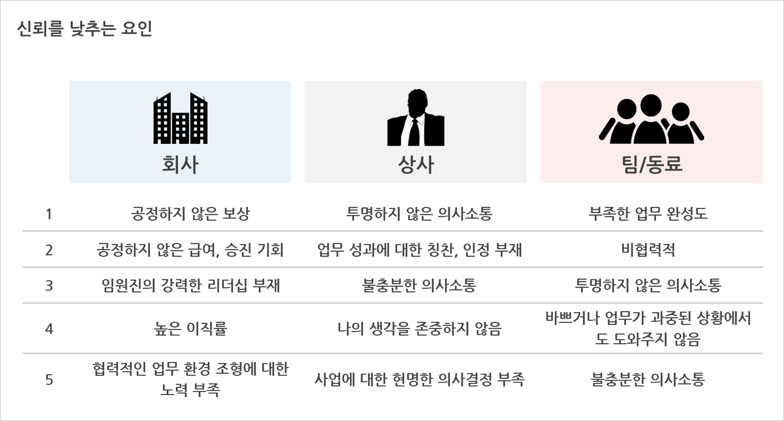 회사에 대해서는 처우가 불공평할 때 신뢰가 낮아지는 것으로 나타났다. 다르게 말하면, 조직원들은 차별이나 편견없이 공정하게 기회를 제공받고, 평가받기를 원한다는 것이다. 상사에 대해서는 의사소통의 부재, 자신의 생각이나 성과를 존중하지 않는 태도가 신뢰를 낮추는 원인으로 나타났으며, 팀/동료에 대해서는 자기가 맡은 업무를 잘 해내지 못하고, 동료를 도와주지 않는 등 팀워크가 낮은 동료에 대해 신뢰 부족을 보였다.