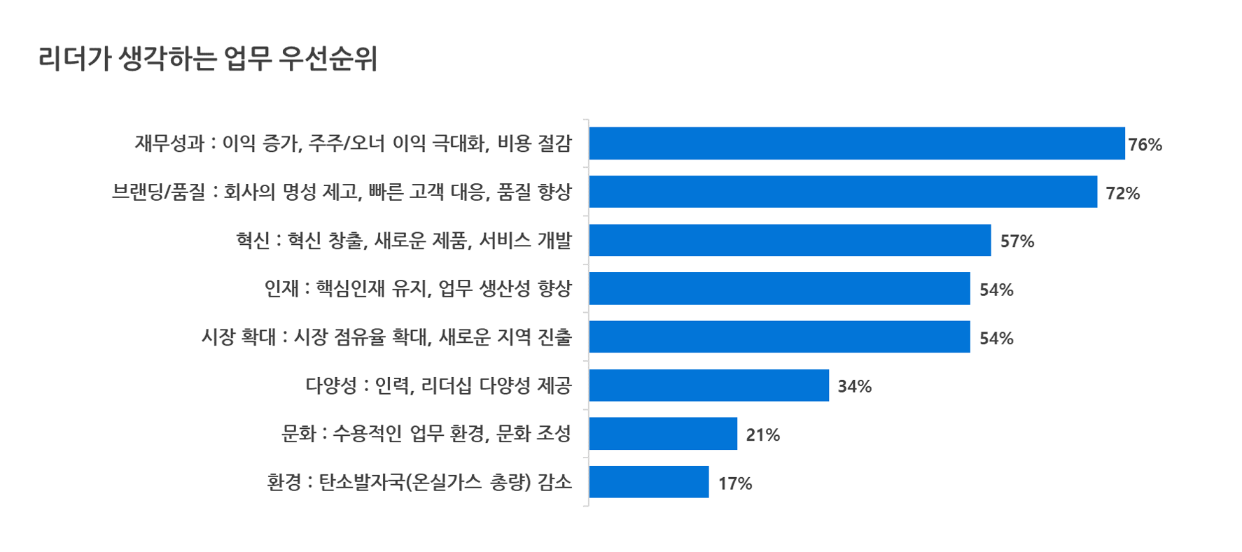 리더들을 대상으로 실시되는 조사들을 살펴보면, 그들은 조직문화, 직원경험 그리고 다양성, 평등, 환경에 기여하는 사회적 가치 기여가 기업의 중요 과제라고 꼽는다. 하지만 이러한 과제들은 그 중요성에 대해 공감할지 몰라도 실제 업무를 추진하는 데에 우선순위로 작용하는 것은 아닌 것으로 보인다. 리더들의 우선순위를 측정한 결과, 사회 기여나 조직문화는 재무성과에 크게 밀리는 후순위인 것으로 나타났다.