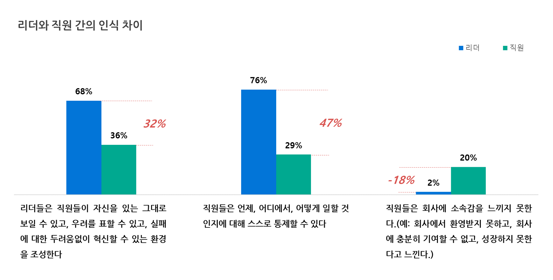 리더들은 직원들이 실제 느끼는 것보다 조직이 더 수용적인 문화라고 평가하고 있었다. ‘자신을 있는 그대로 드러낼 수 있고, 실패에 대한 두려움 없이 혁신할 수 있다’고 느끼는 직원들은 36%에 불과했지만 리더들은 그 보다 32%가 않은 68%가 ‘그렇다’고 생각했다. 유연한 근무환경에 대한 인식도 직원들은 29%가 ‘그렇다’고 응답한 반면 리더들은 76% ‘그렇다’고 응답하였다. 또한 직원들이 조직에 소속감을 느끼지 못할 거라고 평가한 리더는 2%로 소속감을 느끼지 못하는 직원은 거의 없을 것이라 평가했지만, 소속감을 느끼지 못한다고 응답한 직원은 20%로 나타났다.