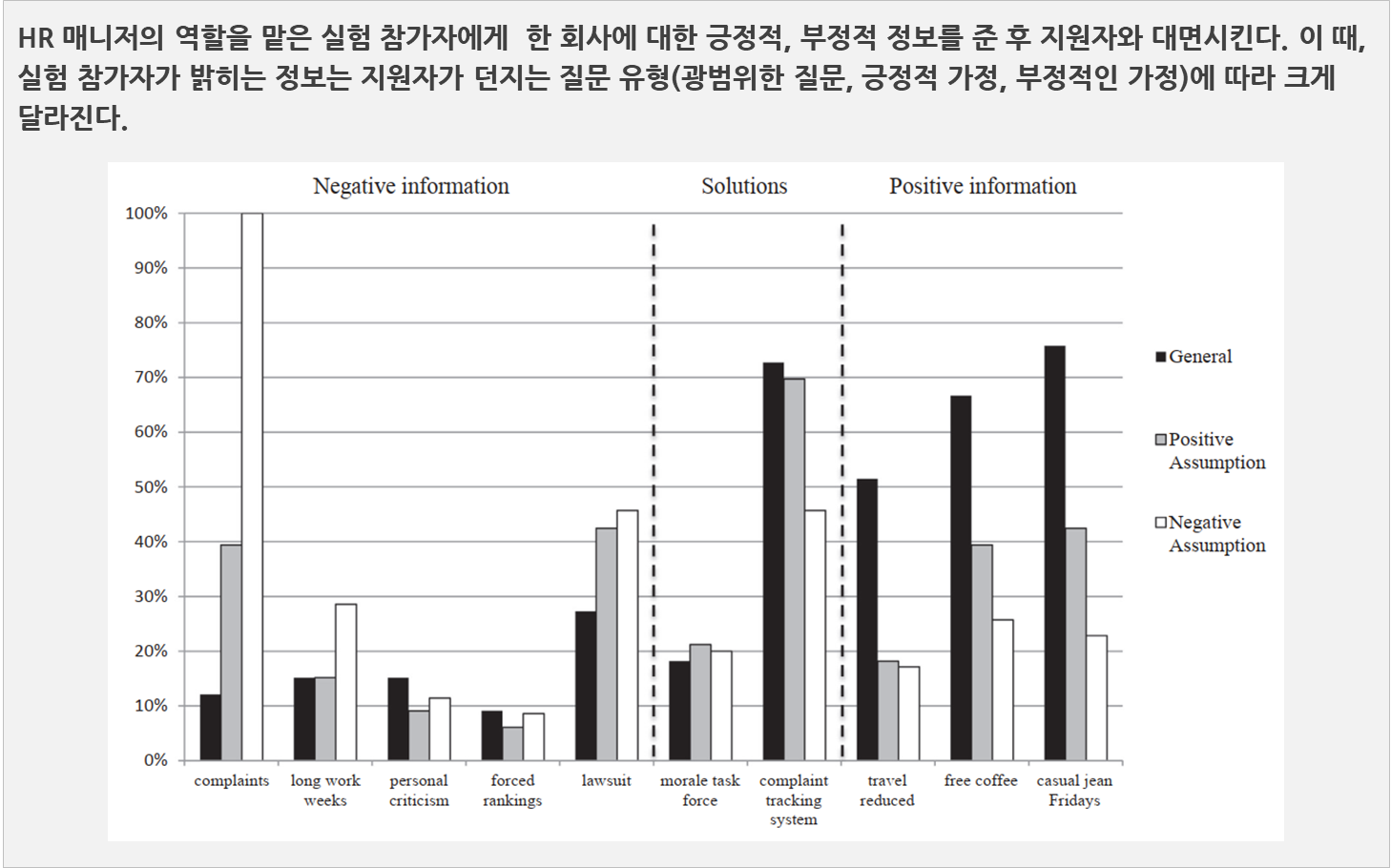 연구자들은 질문의 유형에 따라 대답이 어떻게 달라지는 살펴보기 위해 채용 면접, 상품 거래 상황에서 실험을 실시하였다. 질문은 크게 광범위한 질문(예: 요즘 회사 문화는 어때요?)과 구체적인 질문으로 나누어 지는데, 구체적인 질문은 긍정적 가정이 포함된 질문(예: 직원들이 HR에 큰 불만을 제기하지 않죠?)과 부정적 가정이 포함된 질문(예: 직원들이 HR에 제기한 큰 불만은 얼마나 돼요?)으로 구성되었다.