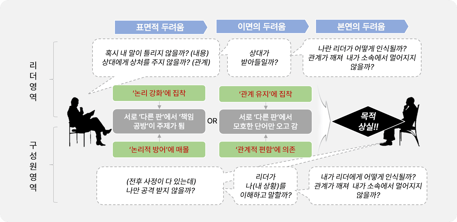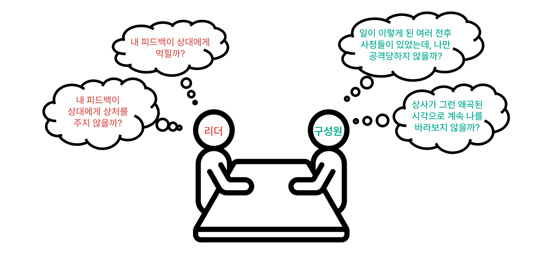 피드백 시 리더 내면의 핵심 두려움은 “내 피드백이 상대에게 먹힐까?” (피드백의 근거나 생각의 차이에 대한 두려움), “내 피드백이 상대에게 상처를 주지 않을까?” (의도와 다른 결과에 대한 두려움)입니다. 다르게 표현된 듯한 두 두려움들은 결국 “관계가 깨져 내가 ‘나쁜 리더(또는 꼰대)’로 인식되지 않을까?” 라는 하나로 귀결됩니다. 결국 ‘좋은 리더’로서 자아 실현을 하고 싶고, 구성원에게 기억되고 싶은 욕구가 피드백 과정 속에서 깨지지 않을까에 대한 두려움이죠.
