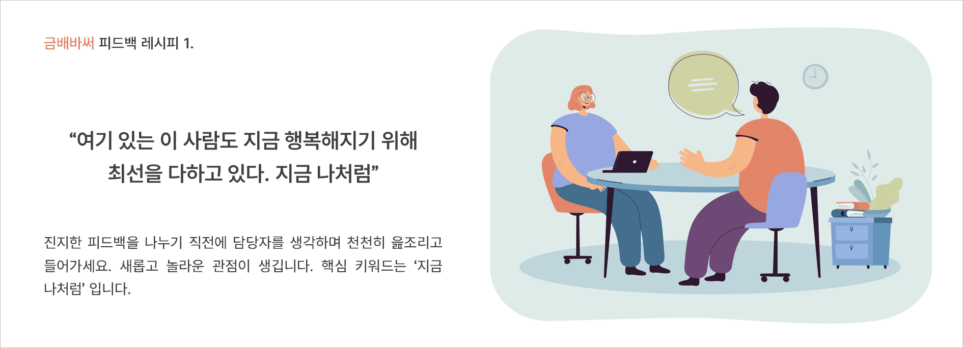 이 글은 조직 현장에서, 피드백이 목에 걸려 망설이다 기회를 놓치고 있는 수많은 리더들을 위한 위로와 응원의 글입니다. 더불어, HRer들의 고민을 함께 모색해보는 글이기도 합니다. 현학적이고 남의 집 이야기 같은 심리학 실험 통계를 근거로 기름 덧칠을 하기 보다는, 변화하는 현장 상황에서 리더들이 언제든 응용 가능하도록 쉬운 근본 원리를 찾아보고 매회 마지막에 ‘금방 배워 바로 써먹는’ 금배바써 레시피를 엄선하여 첨부드립니다. 다만, 이 레시피는 본문의 원리를 이해해야만 맛있게 써 먹을 수 있습니다.