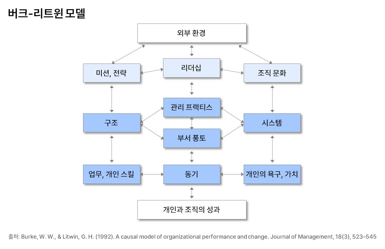 조직심리학자인 워너 버크(W. Warner Burke)와 조지 리트윈(George H.Litwin)은 조직 성과와 변화에 대해 잘 설명하는 모델을 구축하기 위해서는 “조직이 어떻게 작동하는지(무엇이 무엇으로 이어지는지)”와 “어떻게 의도적으로 변화할 수 있는지” 보다 철저히 규명해야 한다고 생각했다. 이러한 관심에서 이들은 조직 성과와 변화에 대한 ‘인과 모델’을 개발하였다.