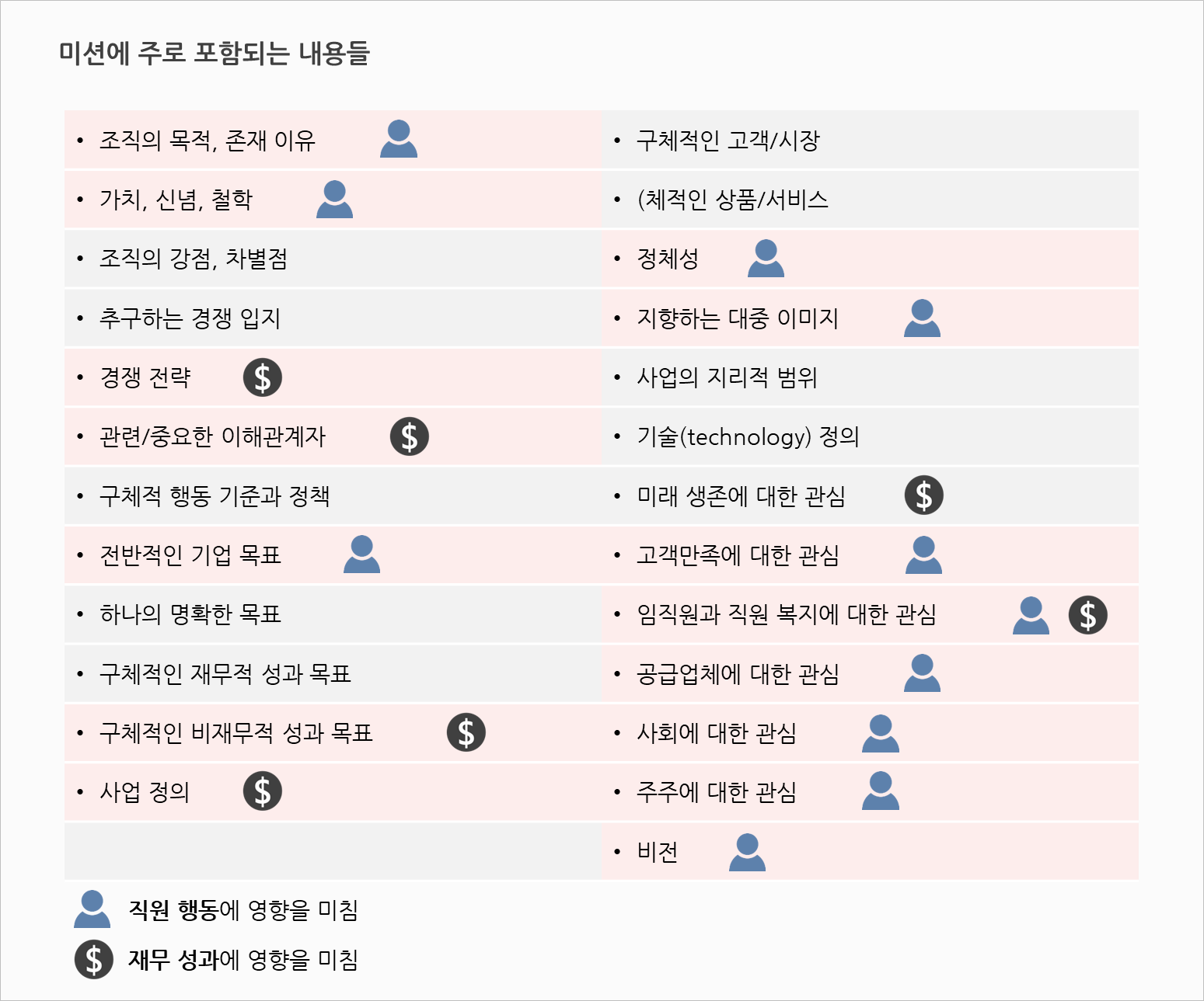 미션이 명확하고, 구체적으로 정의된 경우 조직원의 행동뿐만 아니라 재무적 성과에도 영향을 미치는 것으로 나타났다. 명확하게 정의된 조직의 목적, 가치, 전반적인 기업 목표, 정체성, 대중 이미지, 고객·직원·공급업체·사회·주주에 대한 관심, 비전은 조직원의 행동에 영향을 미친다. 경쟁전략, 이해관계자 규명, 구체적인 비재무적 성과 목표, 사업 정의, 미래 생존에 대한 관심, 직원에 대한 관심은 기업의 재무 성과에 영향을 미치는 것으로 나타났다.