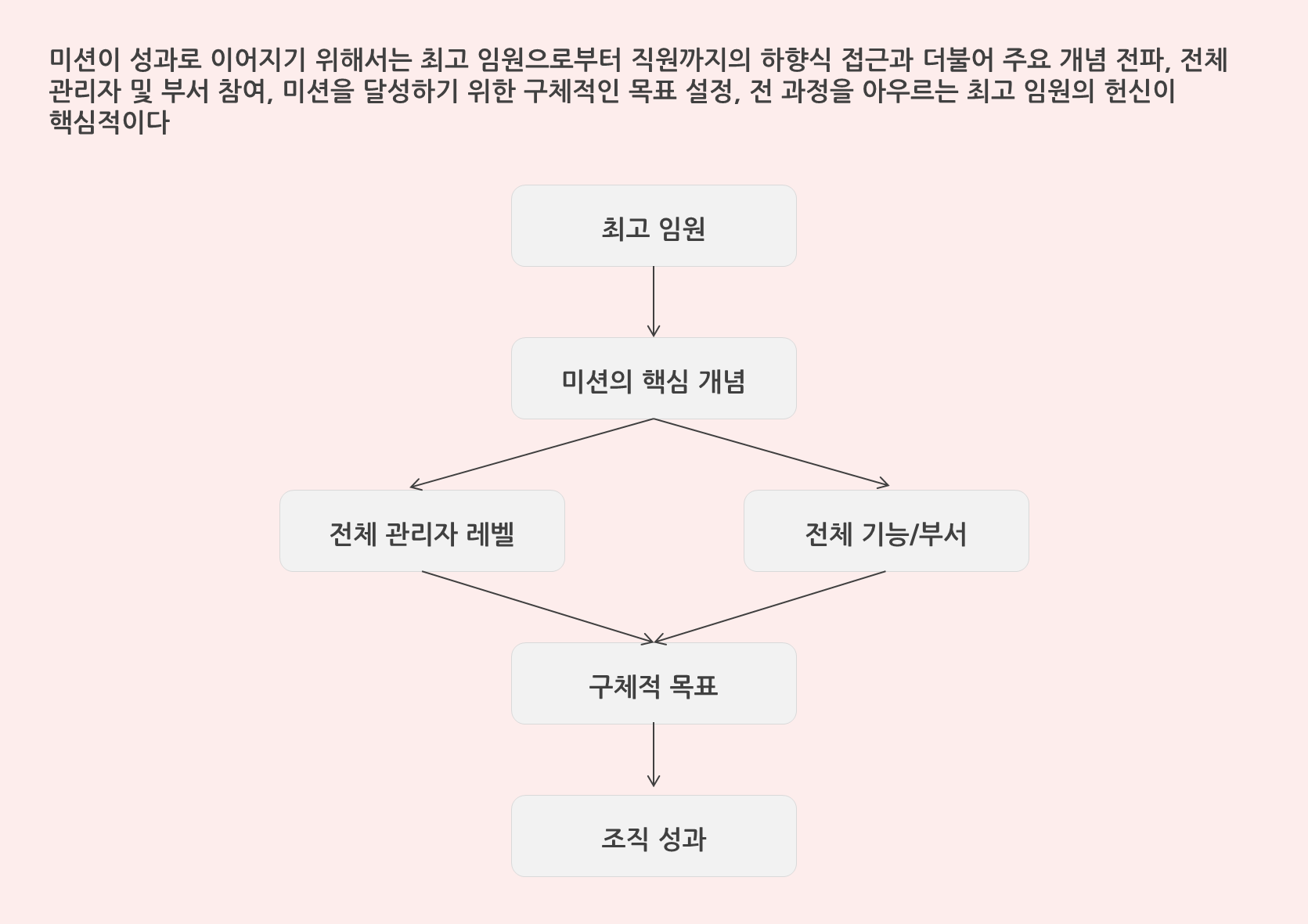 아무리 잘 정립된 미션이라도 벽에 걸린 장식물이 되지 않기 위해서는 소통, 참여를 통해 조직원이 이를 충분히 수용하게 만들고, 제도에 반영하여 지속적으로 실천할 수 있는 발판을 마련해야 할 것이다.