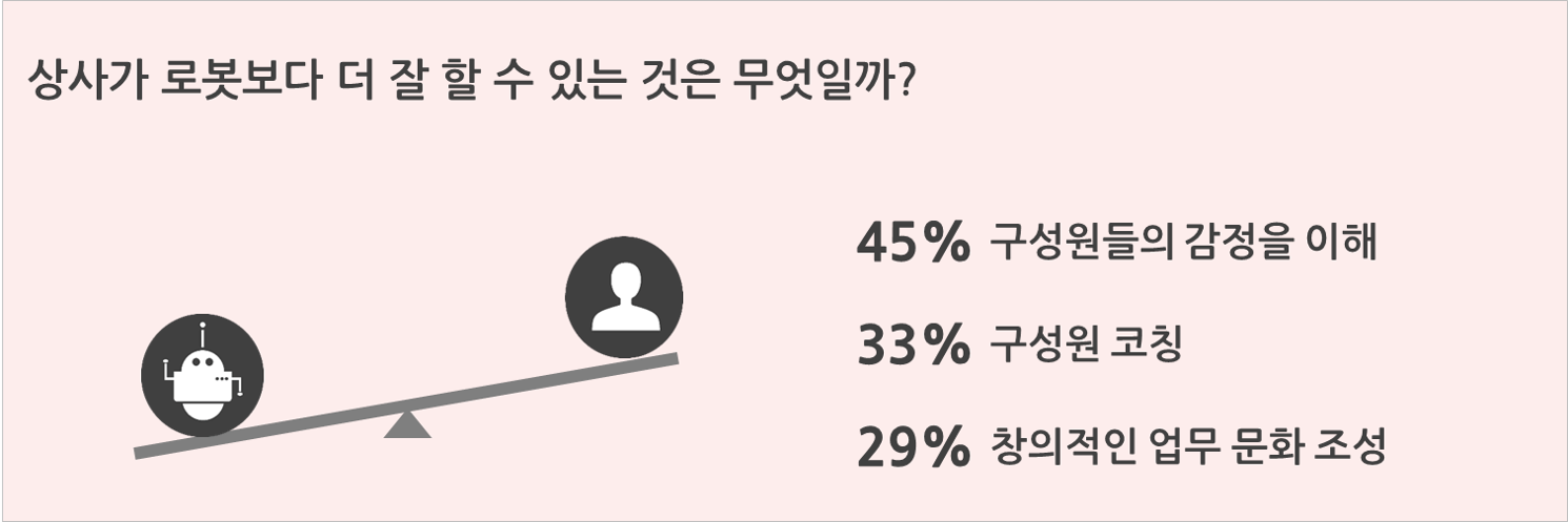 상사가 로봇보다 더 나은 것은 없는 걸까? 응답자들은 상사가 로봇보다 잘 할 수 있는 것으로, 구성원들의 감정을 이해(45%)하고, 코칭(33%)해 주고, 창의적인 업무 문화를 조성(29%)하는 것을 꼽았다.