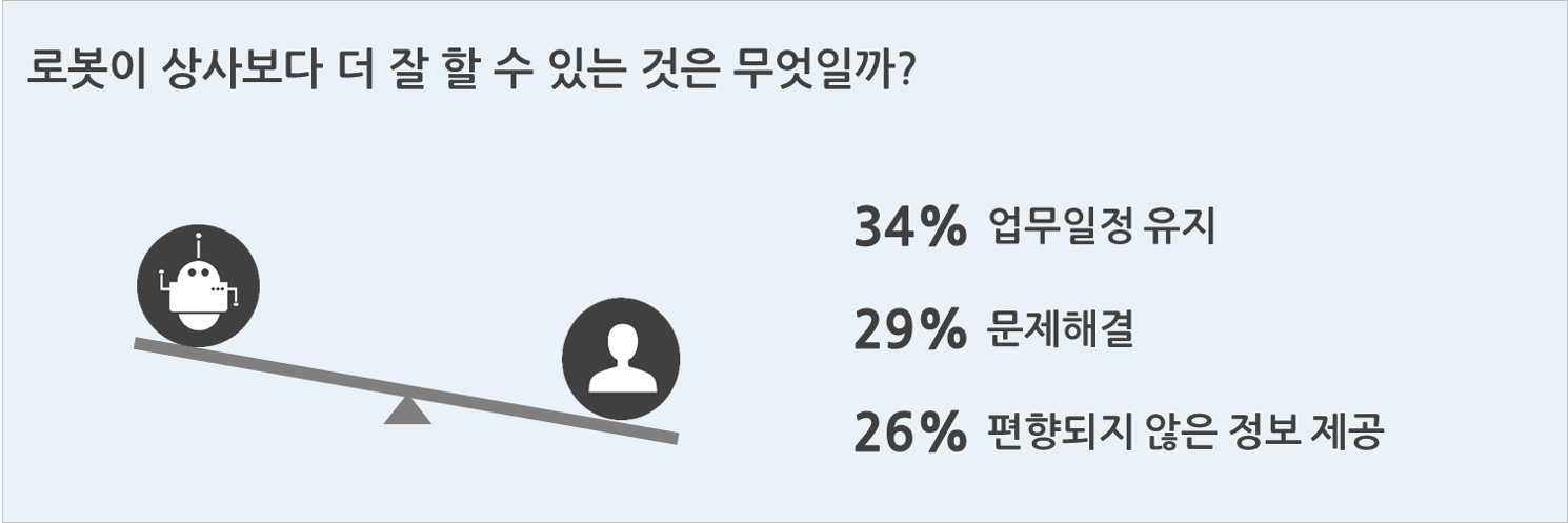 다수(82%)의 조직원은 자신의 상사보다 로봇이 일을 더 잘 할 것이라고 생각하고, 절반 이상이 조언이 필요할 때 상사보다 로봇을 찾는다고 응답했다.