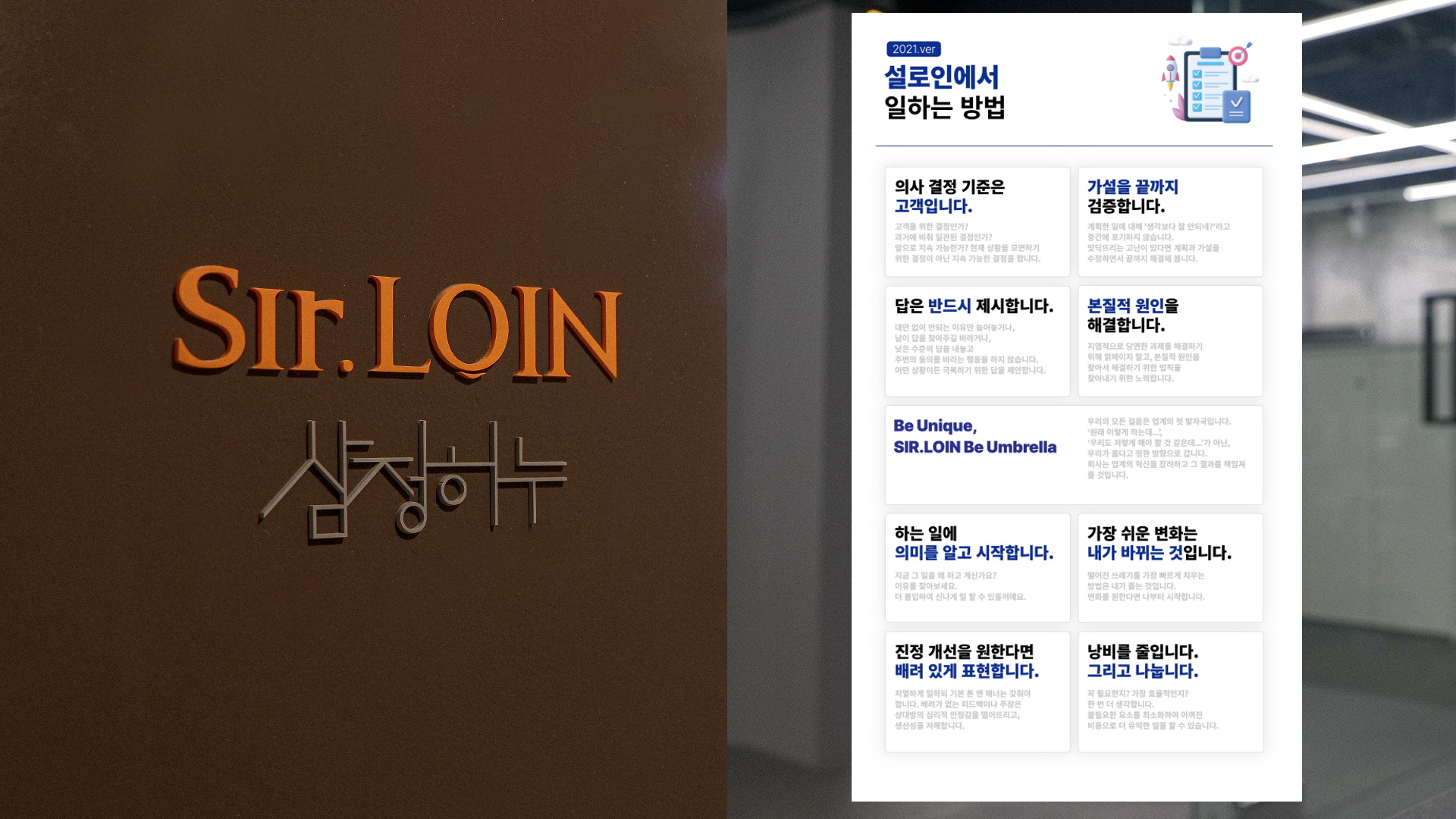 설로인은 단백질 효소의 최적활성도를 조정하여 고기의 효소를 촉진시키고 온도, 미생물 수치, 외부충격 등을 통제하여 고기를 최적의 상태로 유지하여 ‘최고의 고기 경험을 일정하게 주는 브랜드’를 만들고자 하는 비전이 있습니다. 이런 연구개발적인 미션을 달성하기 위해 설로인이 일하는 방법에는 ‘가설을 세우고 끝까지 검증하라’는 항목이 있습니다. 우리 회사의 미션 달성을 위해서는 우리 회사에 맞는 고유의 전략(방법)이 있어야 하지 않을까요?