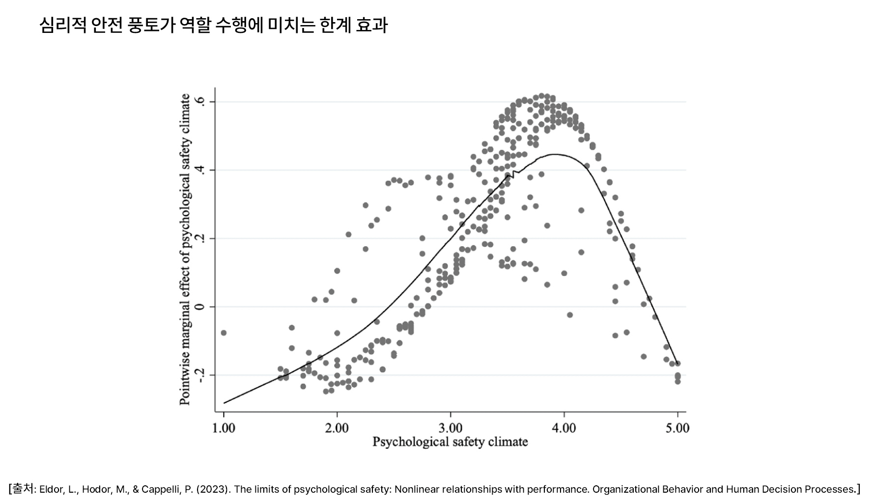 연구 참여자들의 데이터를 분석하자, 심리적 안전감이 업무 수행에 미치는 한계 효과가 분명하게 드러났다. 심리적 안전 풍토(psychological safety climate)는 4 수준(80 백분위수)까지는 이것이 높아질수록 업무 수행도가 높았지만, 이 수준을 넘어가면 긍정적인 영향이 급격히 감소하여 4.75 수준(97.5 백분위수)부터는 부정적인 영향으로 바뀌는 것을 확인할 수 있었다.