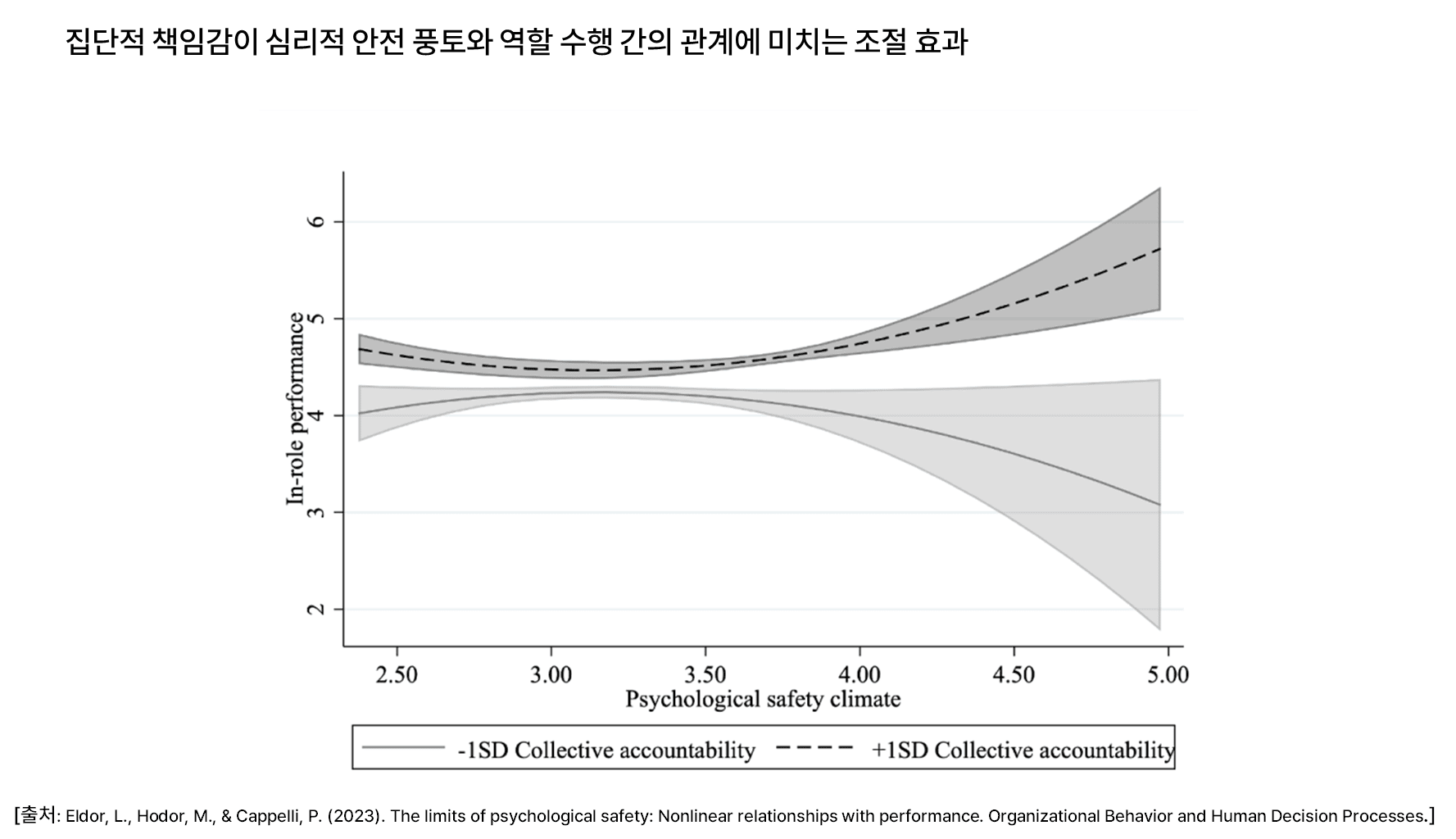 응답 데이터를 분석한 결과 집단적 책임감은 심리적 안전감의 부정적인 영향을 완충하는 것으로 나타났다. 집단적 책임감이 낮은 경우에는 심리적 안전감이 업무 수행에 미치는 한계 효과가 나타났다. 즉, 심리적 안전 풍토 수준이 3.34를 초과하면 오히려 업무 수행에 부정적인 영향을 미쳤다는 것이다. 반면 집단적 책임감이 높은 경우에는 심리적 안전감의 한계 효과가 나타나지 않았다. 연구자들은 보다 신뢰할 수 있는 결과 해석을 위해 동일한 방식으로 하이테크 IT, 소매업 환경을 대상으로 추가 조사를 진행하였는데, 앞의 연구들과 일치된 결과를 확인하였다.