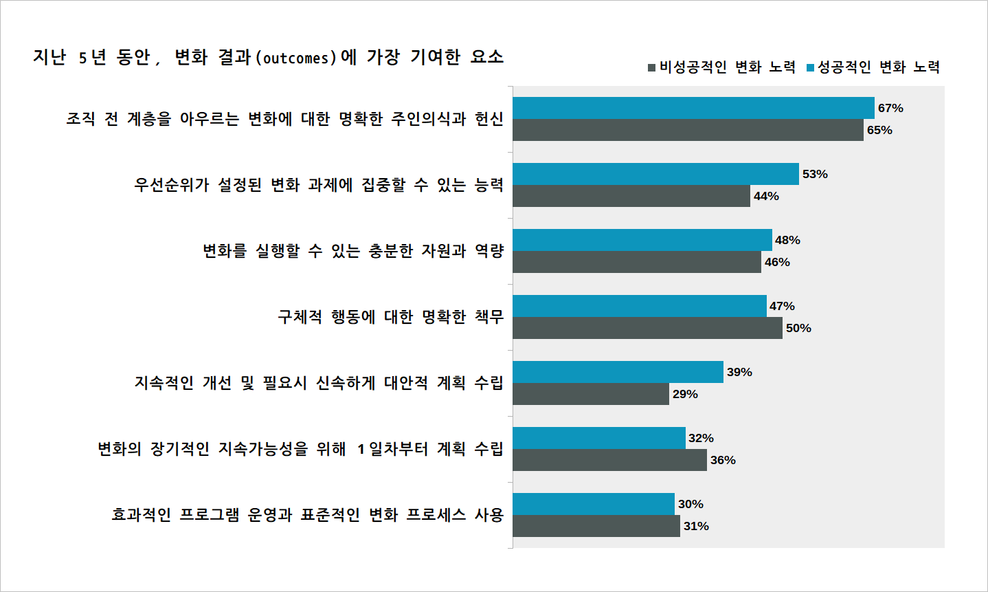 맥킨지가 2,200명의 임원들을 대상으로 실시한 조사에 따르면, 변화 실행에서 가장 중요한 요소는 ‘변화에 대한 주인의식과 헌신’, ‘변화 과제의 우선순위화’, ‘변화 실행을 위한 자원과 역량’인 것으로 나타났다.