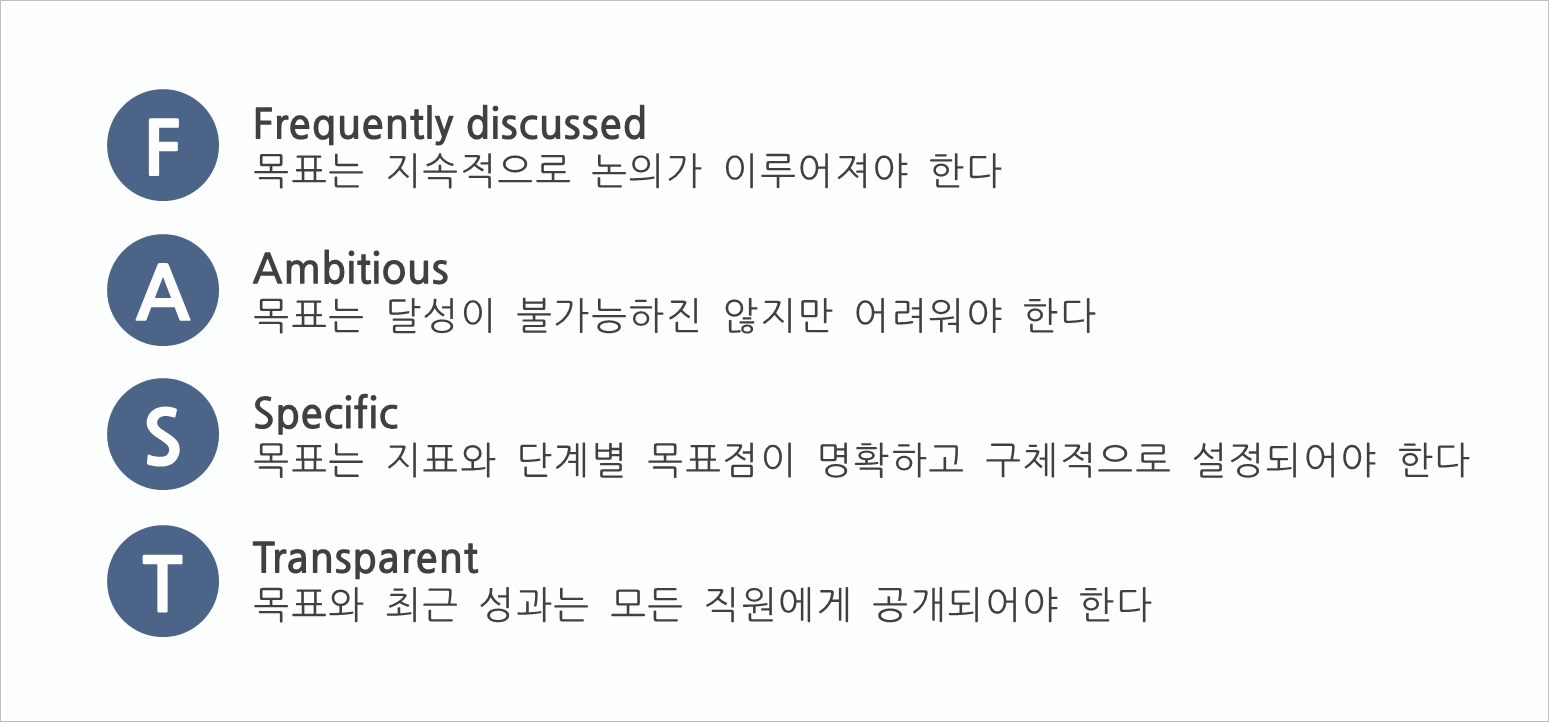 따라서 원활한 전략 실행을 위해서는 지속적인 논의(Frequently discussed), 야심차고(Ambitious) 명확한(Specific) 목표 설정, 투명한 목표 공유(Transparent)에 따라, 즉 FAST 원칙에 기반하여 목표를 설정해야 한다고 말한다.