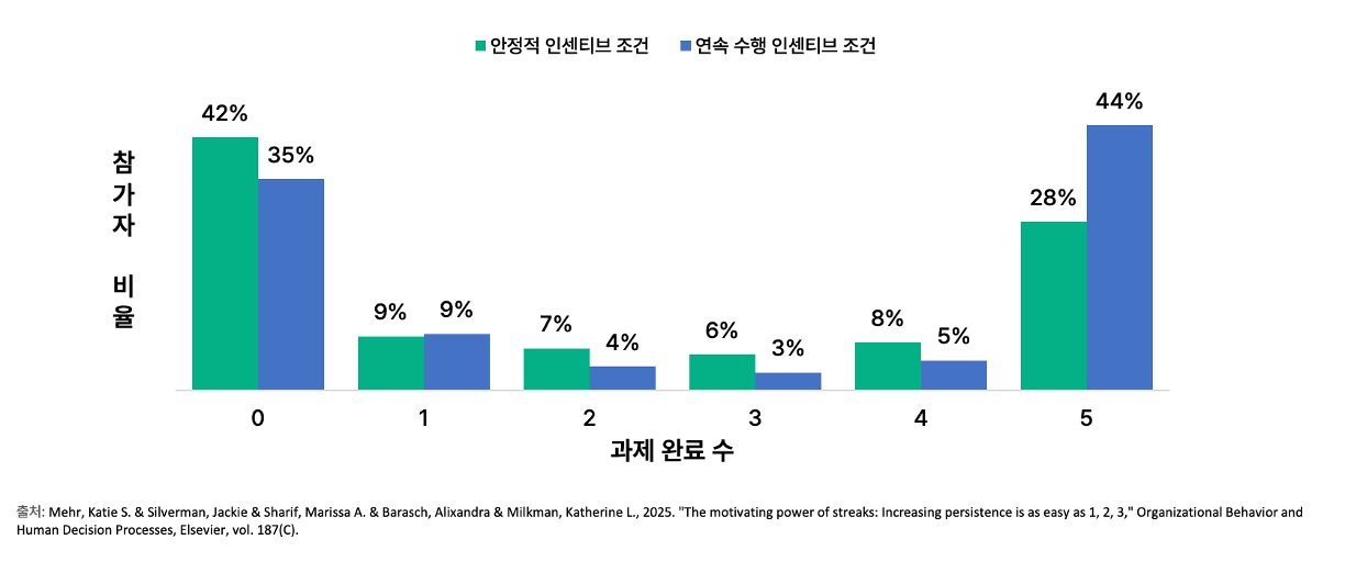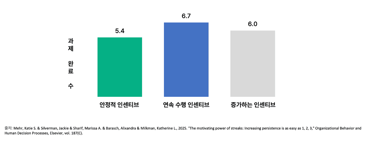 연속 수행 인센티브(streak incentives)란 여러 개의 작업을 연속으로 완료했을 때 제공하는 보상을 의미한다. 사람들은 운동, 교육 등 무언가를 새로 시작할 때 “한 번 빠지기 시작하면 계속 쉬게 되니까 안 빠지고 열심히 다닐 거야”라고 다짐을 하곤 한다. 이 말에서도 알 수 있듯이, 사람들은 잘 이어온 행동을 깨고 싶어 하지 않는 경향이 있다. 예를 들어, 10일째 하루도 빠지지 않고 매일 운동을 하고 있다면 그 기록을 깨고 싶지 않아서 몸이 피곤하더라도 11일째에도 운동을 하게 된다는 것이다.