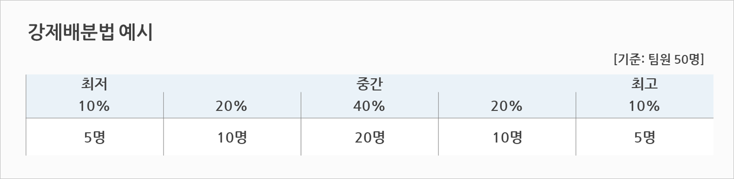 강제배분법은 정해진 비율에 맞게 피평가자를 배분해야 하기 때문에 평가가 한쪽으로 치우치는 것을 방지한다. 하지만 강제배분법의 근간인 정규분포 가정은 조직에 적용되지 않는 경우가 많다.