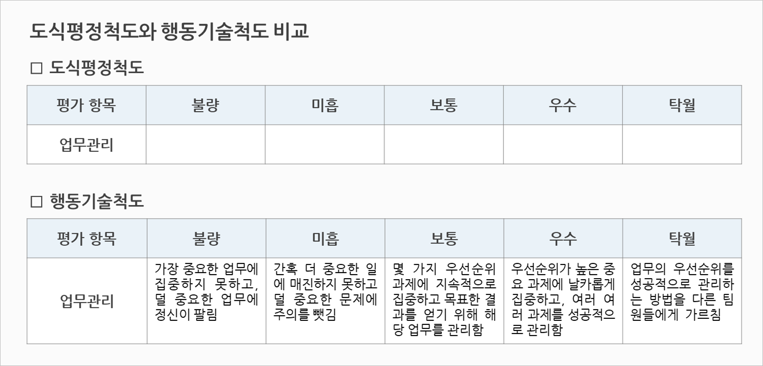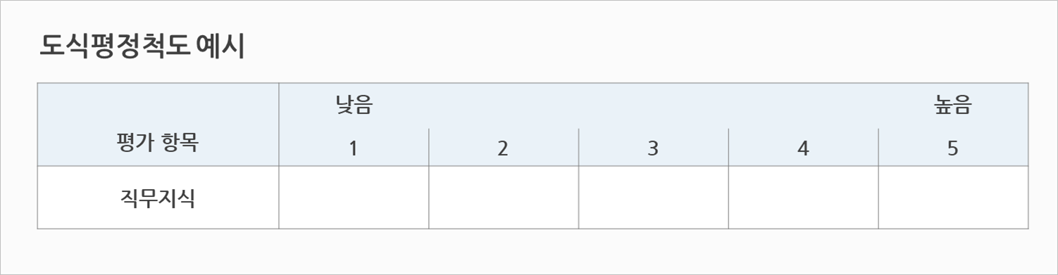 이러한 평가 방법은 평가 항목 및 척도의 정의 부족으로 인해 많은 부분을 평가자의 주관에 의존한다는 한계가 있었다. 예를 들면, 부하직원의 직무지식을 평가할 때 ‘무엇을 직무지식으로 보느냐’에서부터 ‘높음’으로 평가될 수 있는 ‘직무지식의 수준은 무엇인가’에까지 개인마다 판단 기준이 제각각이었다는 것이다.