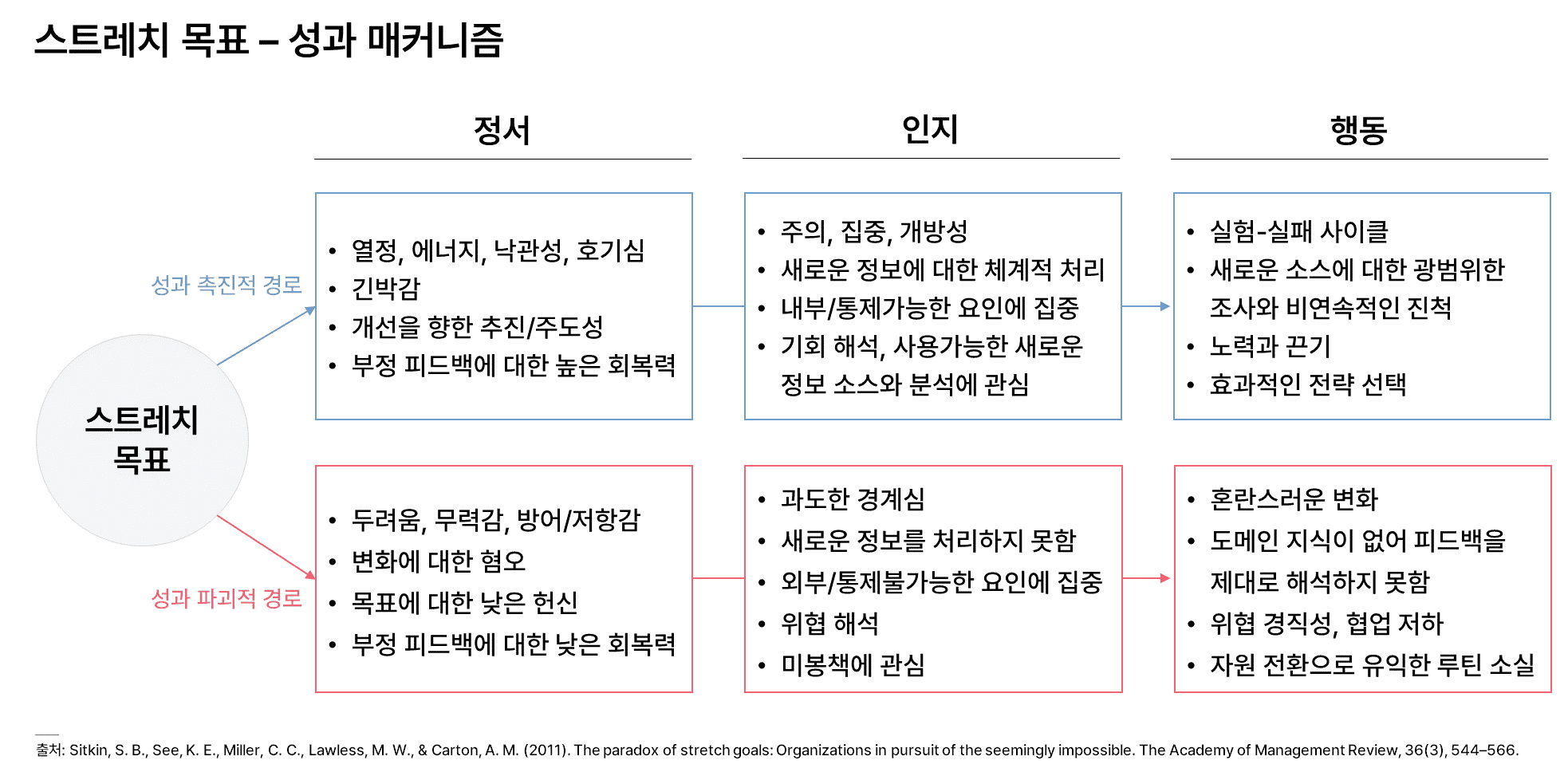 정리하면, 스트레치 목표 자체가 성패를 결정하는 것이 아니라 이것이 학습과 성과를 촉진적 혹은 파괴적 영향을 미치도록 만드는 요인이 따로 있다는 것을 알 수 있다. 그렇다면 그것은 무엇일까? 시트킨은 ‘최근 성과’와 ‘여유 자원’이라고 말한다.