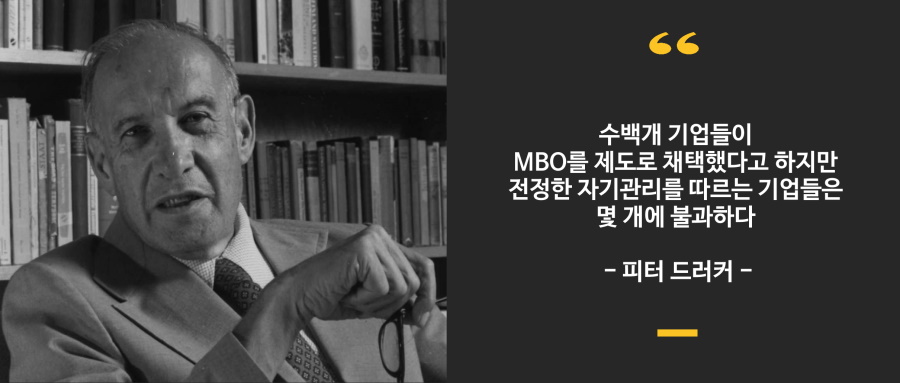내가 처음으로 MBO라는 용어를 제안한 이래로 MBO는 광범위하게 사용되는 슬로건이 되었다. 책, 경영 수업, 세미나, 심지어는 영화에서도 MBO를 다룬다. 수백여개의 기업들이 MBO를 제도로 채택했다고 하지만 진정한 자기관리를 따르는 기업들은 몇 개에 불과하다. MBO와 자기관리는 슬로건, 테크닉, 제도 이상이다. 이것은 헌법 원리이다. -피터 드러커 –