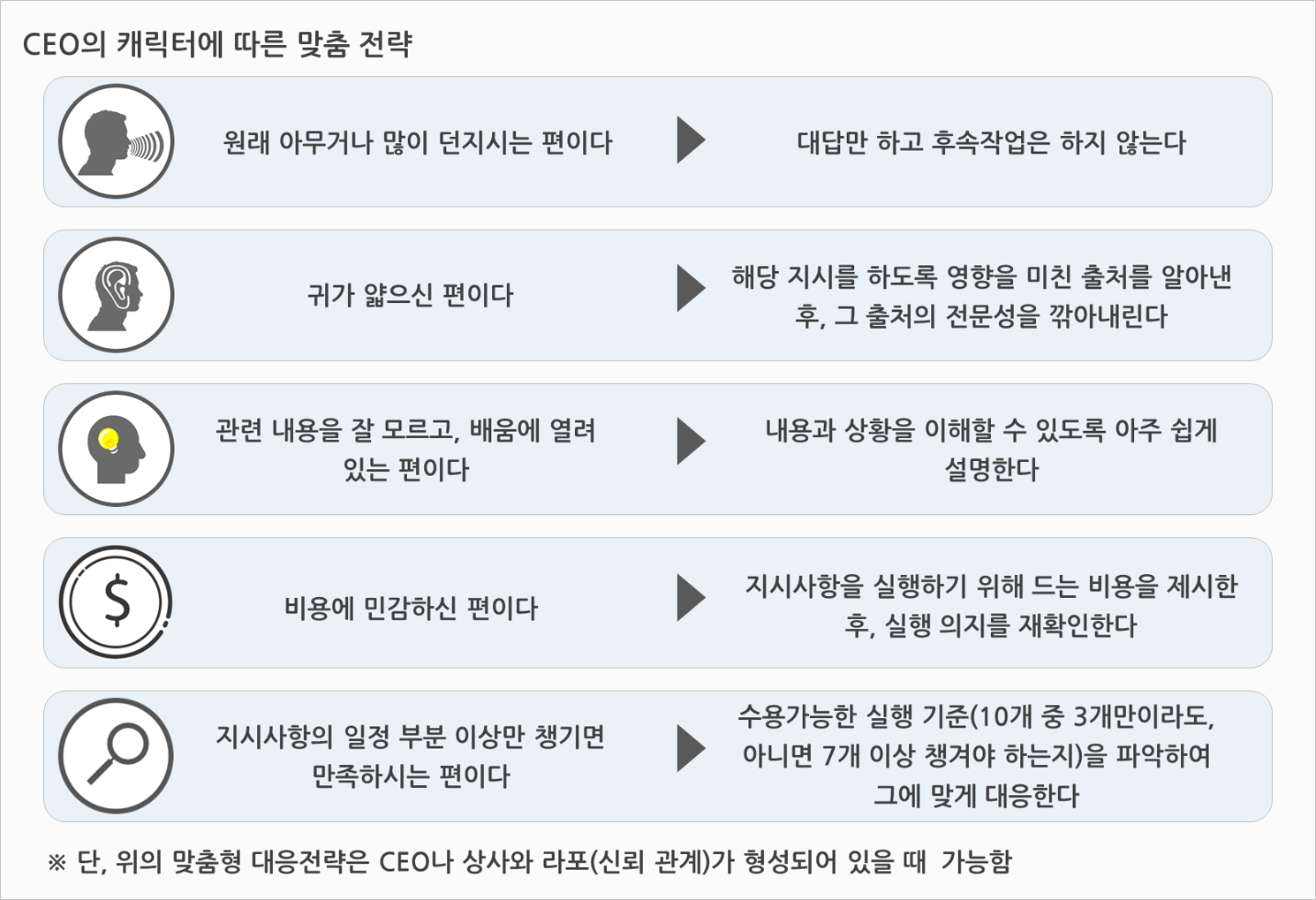 분석형은 CEO의 캐릭터 파악에서 시작한다. CEO의 유형과 상황이 파악되면, 해당 유형에 효과적인 방법을 선택하여 대응한다. 주의해야 할 것은 이 방식은 CEO와 어느 정도 신뢰 관계가 형성되어 있을 때 가능하다는 것이다.