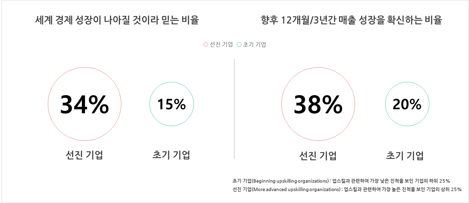업스킬은 CEO의 경제 성장에 대한 낙관적인 기대, 확신과 상관을 보인다. 선진 기업의 CEO는 세계 경제 성장이 나아질 것이라 믿는 비율이 34%인 반면 초기 기업의 CEO는 15%인 것으로 나타났다. 또한 향후 1년/3년 간 매출 성장을 얼마나 관망하느냐에 대한 질문에 선진 기업은 38%가 “매우 확신한다”라고 응답하였으나, 초기 기업은 20%만이 동일하게 응답하였다.