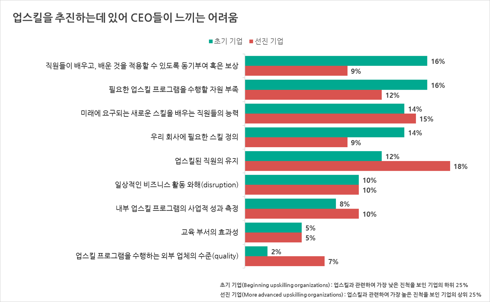 초기 기업의 경우, 새로운 스킬을 배우고 업무에 적용하도록 동기부여 하거나 보상을 통해 이를 장려하는 것과 업스킬 프로그램을 수행할 자원 부족을 가장 큰 어려움으로 꼽았다. 반면 선진 기업은 스킬을 업그레이드한 직원을 계속 유지하는 것을 가장 큰 어려움으로 느끼고 있었다.