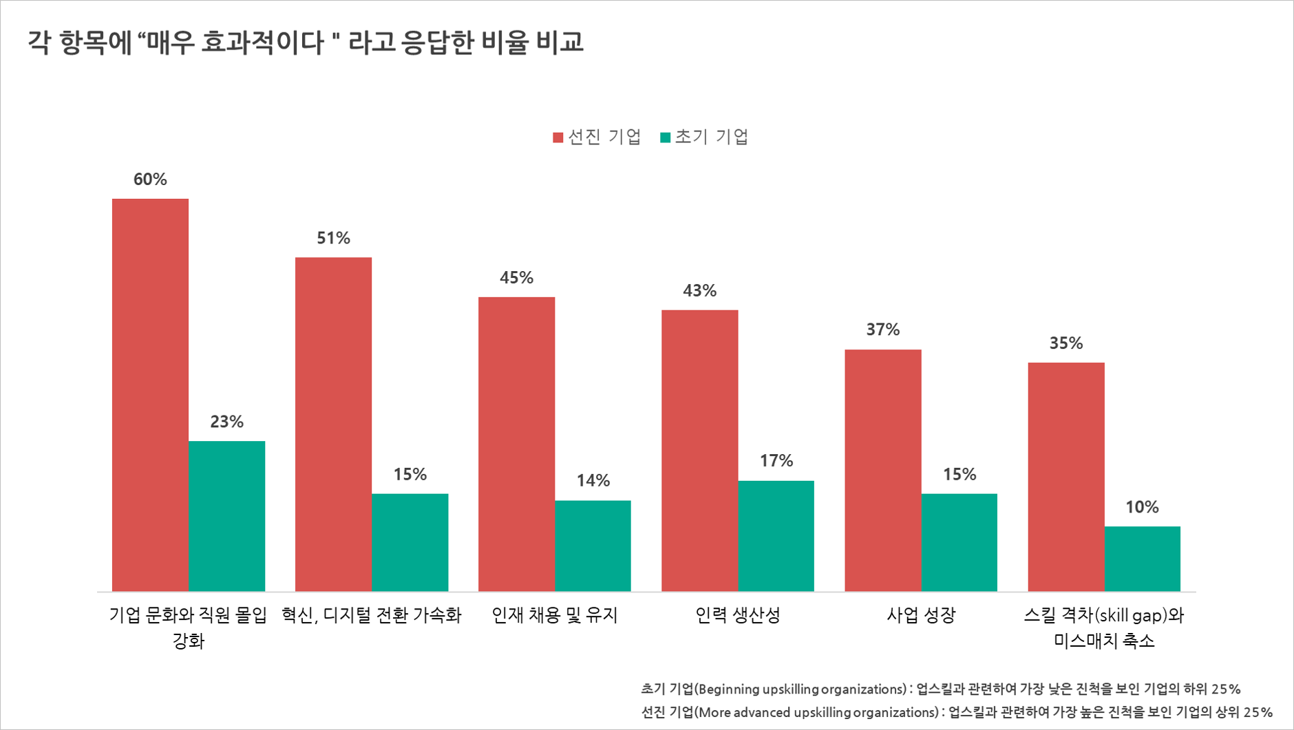 선진 기업은 직원 몰입, 생산성, 인재 채용 등 여러 부분에서 초기 기업보다 더 높은 성과를 보였다. 선진 기업은 ‘기업 문화와 직원 몰입’에 대해 “매우 효과적이다”라고 응답한 비율이 60% 반면 초기 기업은 23%에 그쳤다. 선진 기업은 ‘혁신과 디지털 전환 가속화’, ‘인재 채용 및 유지’, ‘스킬 결차와 미스매치 축소’에서 초기 기업보다 3배 이상 높은 긍정 응답을 보였다.