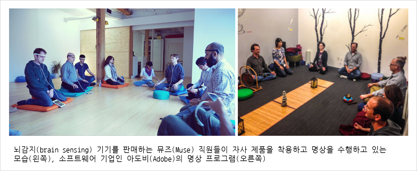 알아차림(mindfulness), 명상(meditation)을 조직원의 웰빙 프로그램으로 채택하고 있는 기업이 지속적으로 증가하고 있다. 2000년대 들어서 하나, 둘 도입되기 시작한 명상프로그램은 구글, 애플, SAP 등의 테크 영역 뿐만 아니라 골드만삭스, P&G, 몬산토, 나이키, HBO 등 다양한 기업에서 운영되고 있다. 2017년에 실시된 한 조사에 따르면, ‘알아차림 강의나 훈련을 개설할 것’이라는 기업은 35%에 이르렀으며, 이는 2016년 응답(22%)과 비교했을 때 13%나 상승한 수치이다. ‘알아차림 훈련의 도입을 고려하고 있다’는 응답(26%)까지 고려하면, 61%의 기업들이 명상에 대해 긍정적인 기대를 갖고 있다고 해석할 수 있다.