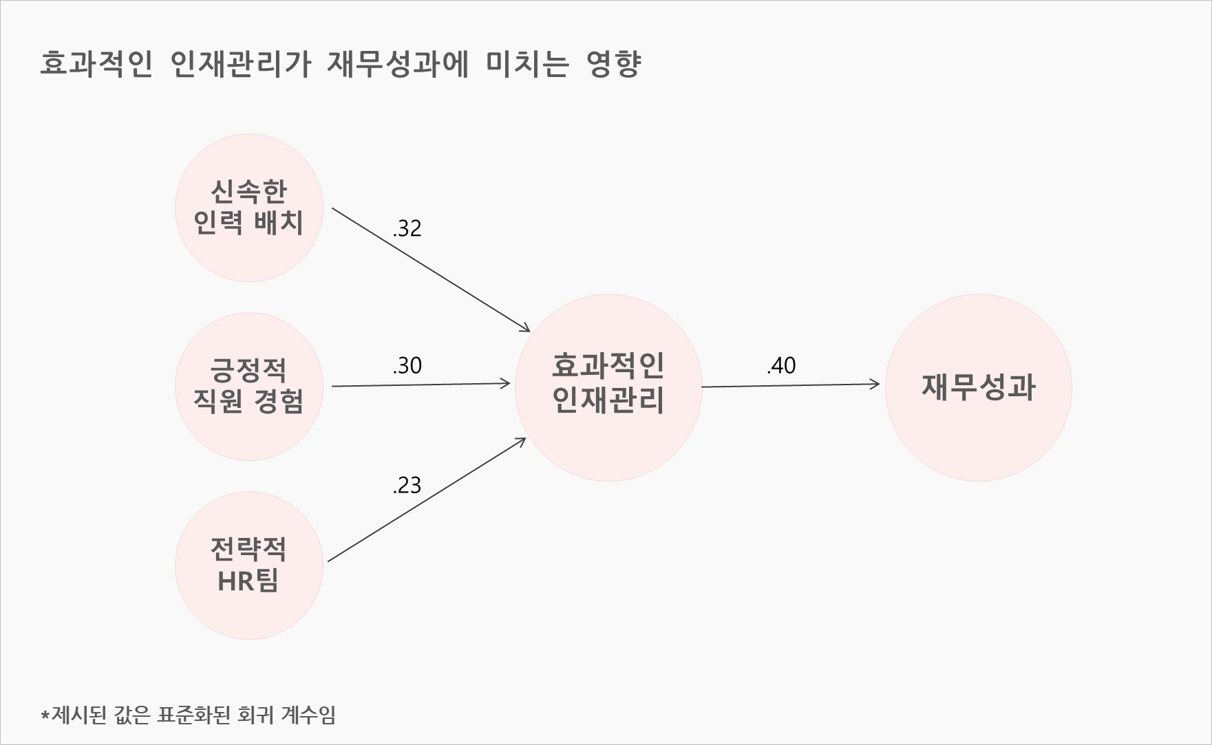 인재관리(talent management)가 기업 성과를 결정하는 핵심적인 요인이라는 것에 대해서는 이견이 없는 반면 효과적인 인재관리란 무엇인가에 대해서는 연구자마다 강조하는 항목이 다르다. 그러나 최근 발표된 맥킨지의 연구 결과에 따르면, 효과적인 인재관리에 가장 큰 영향을 미치는 요인은 ‘신속한 인력 배치’, ‘긍정적 직원 경험’, ‘전략적 HR 팀’인 것으로 밝혀졌다. 이 세 요인은 ‘조직원의 전략 이해도’, ‘임원들의 인재관리 관여도’, ‘데이터 기반 인사 결정’보다 더 큰 설명력을 갖는 것으로 나타났다.