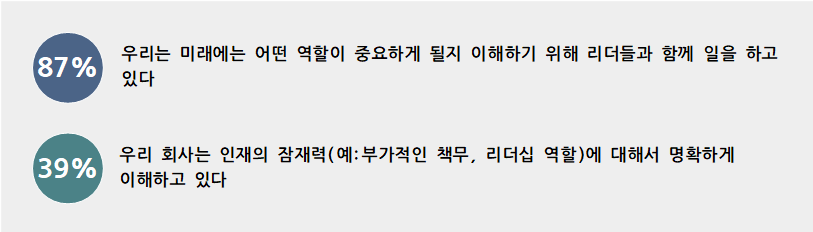 HR은 변화 대응에 대한 필요성은 높게 인식하고 있지만 운영 방향 설정은 아직 미흡한 것으로 보인다. 응답자들은 ‘미래에는 어떤 역할이 중요하게 될지 이해하기 위해 리더들과 함께 일을 하고 있다(81%)’, ‘우리 HR 부서에서는 미래 직무와 이를 지원할 수 있는 조직 구조 및 프로세스 설계를 고민하는 데에 시간을 할애하고 있다(61%)’라고 응답한 반면, ‘우리 회사는 인력 잠재력(예:부가적인 책무, 리더십 역할)에 대해서 명확하게 이해하고 있다’라고 응답한 비율은 39%에 불과했다.